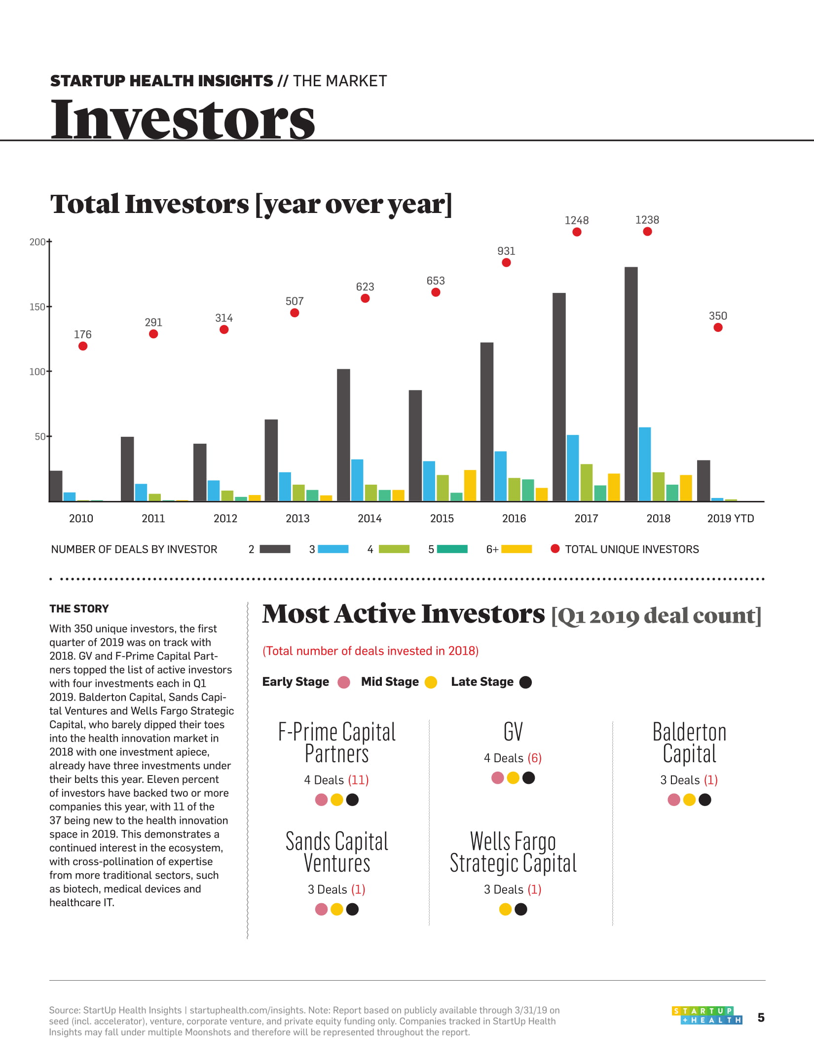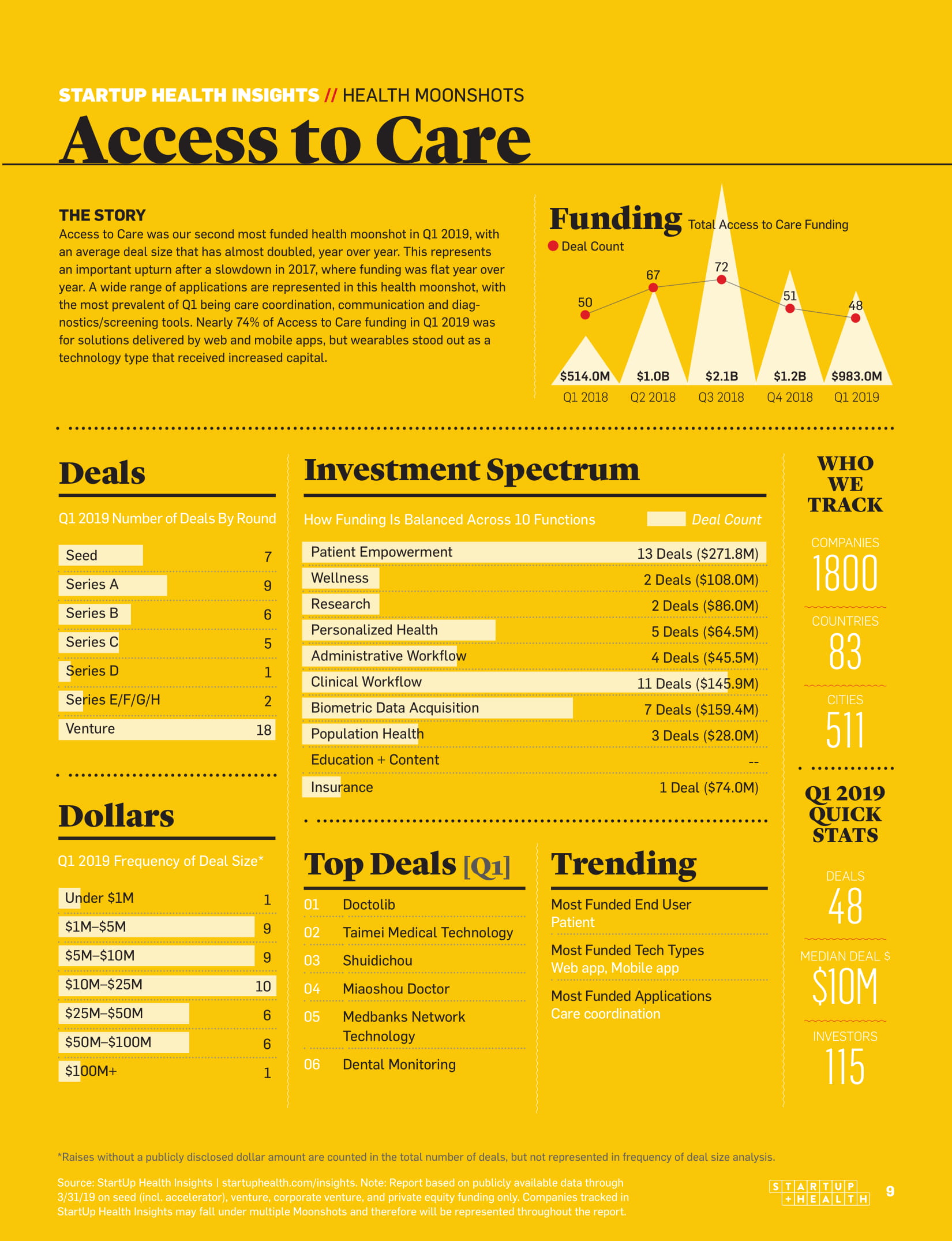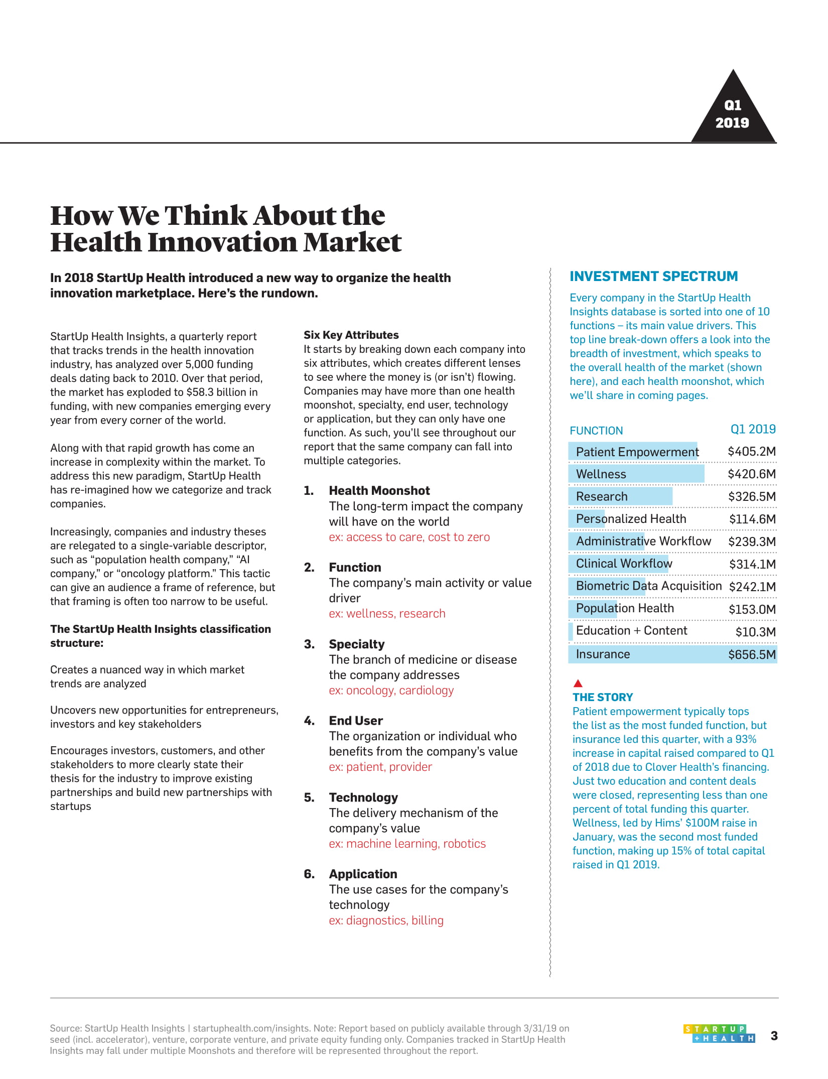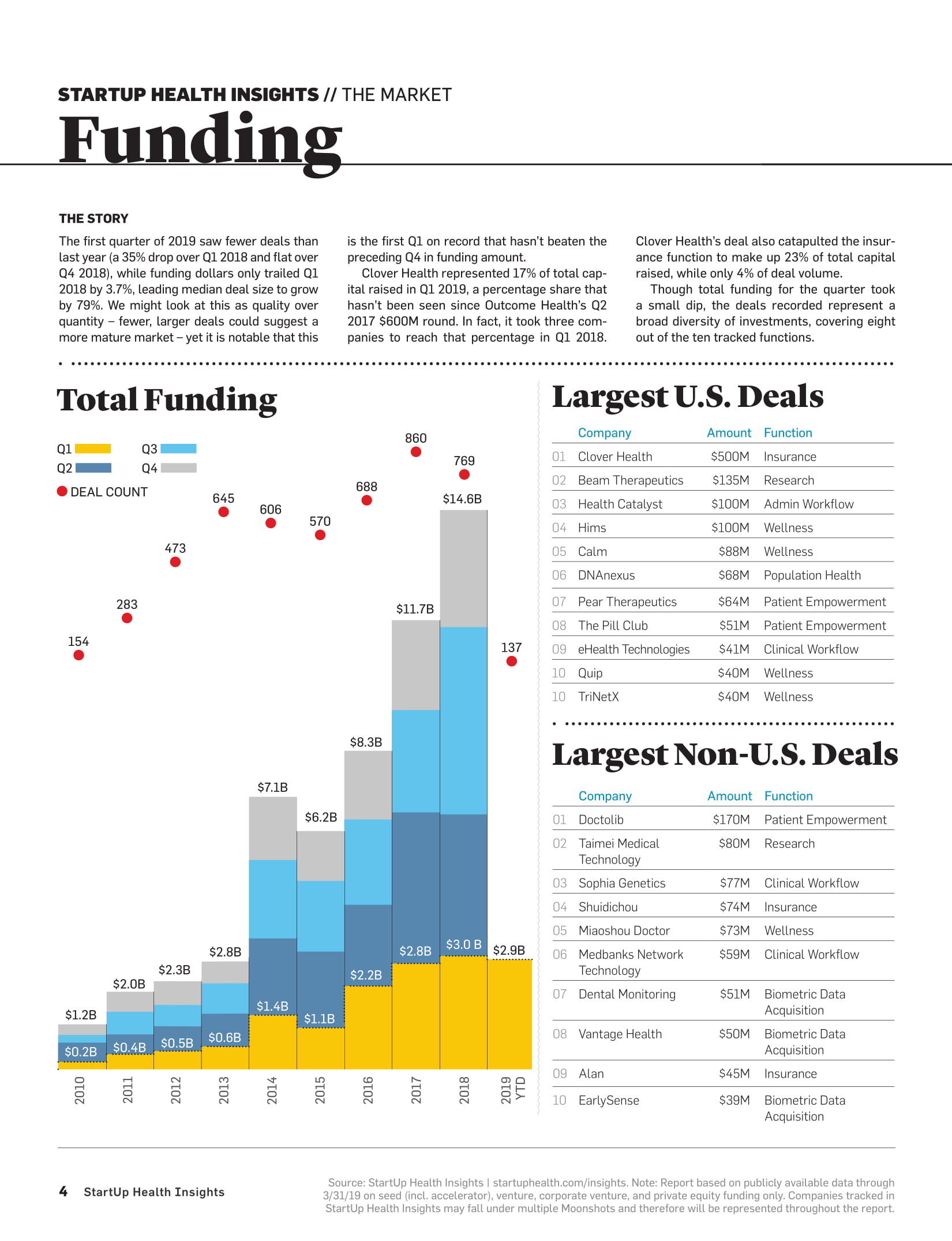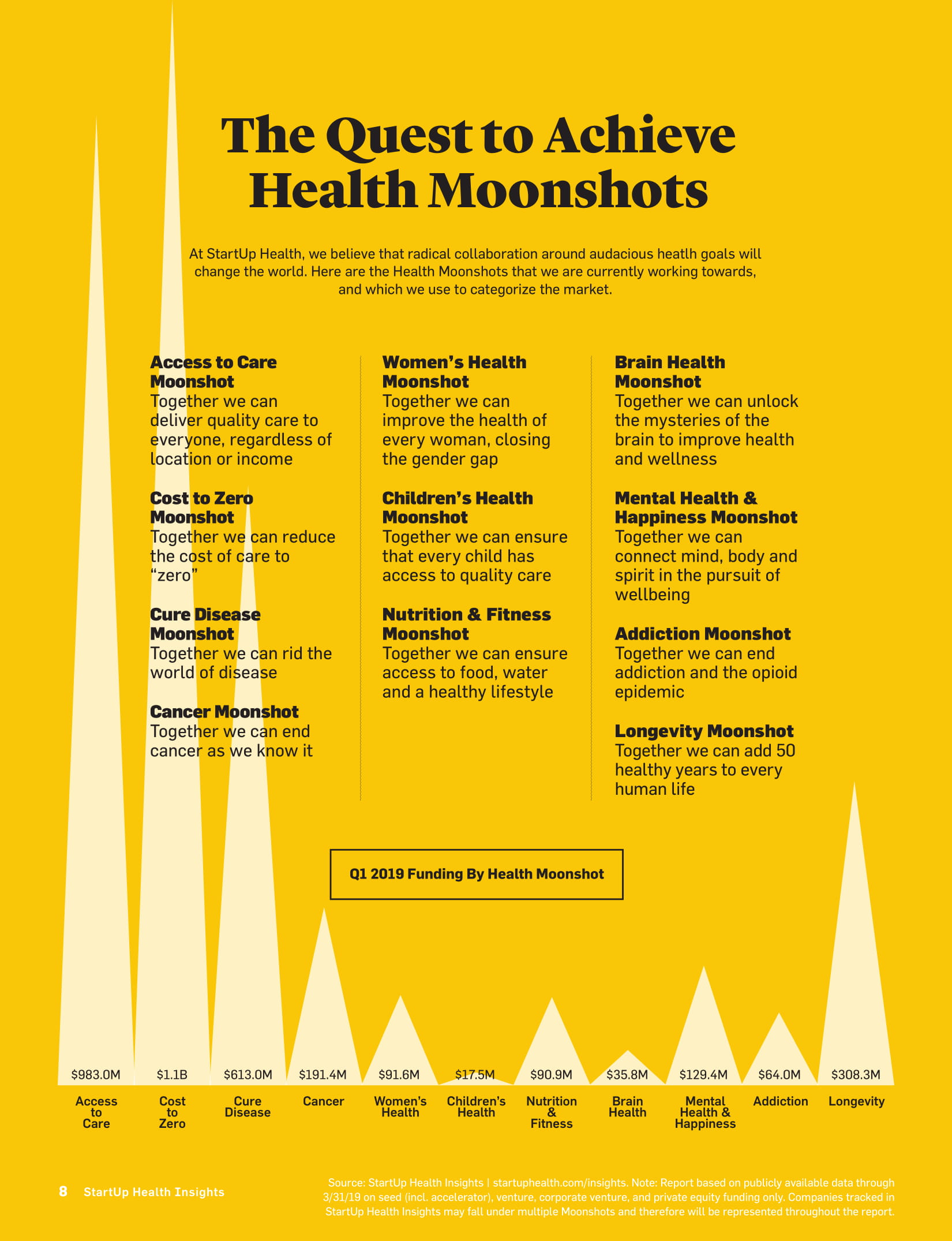 Startup Health发布了最新的“Q1 2019 医疗健康初创企业洞察”。“数字健康”正在融合所有医疗保健部门,如健康IT、生物技术、医疗技术、制药、医疗服务等等。Startup Health认为最重要的是“健康创新”,除了数字解决方案、联网和数据之外,还需要包括新的商业模式、设计思维以及其他有助于改变医疗健康的基本要素。通过这些,我们可以专注于解决世界上最大的健康挑战,例如有效地为数十亿人提供优质护理、治疗癌症,或者从根本上降低医疗成本。Startup Health认为健康创新的发展速度超过了我们的想想,但是也比我们需要的速度慢。它现在是一个充满活力的全球市场,真正的创新可能还未到来。