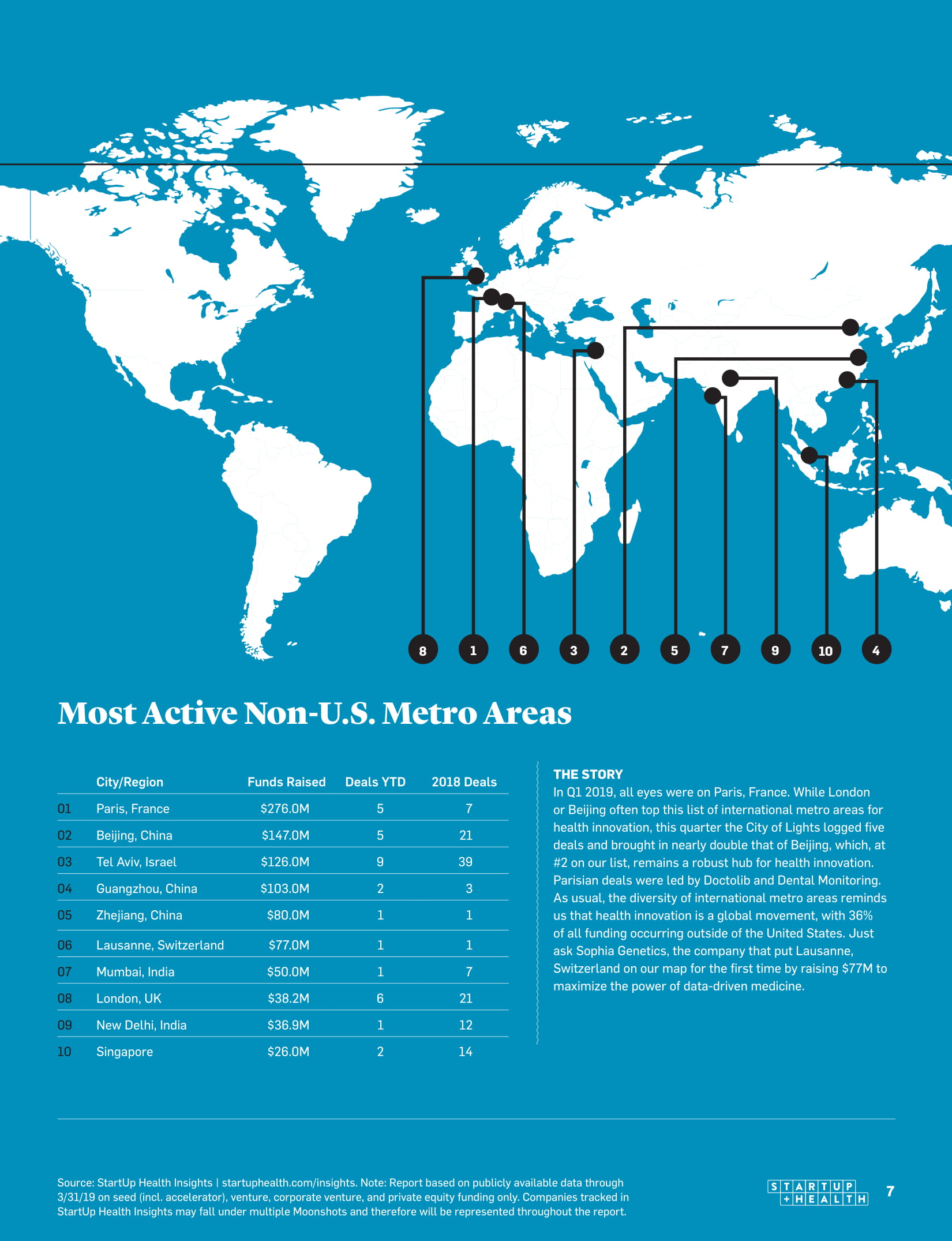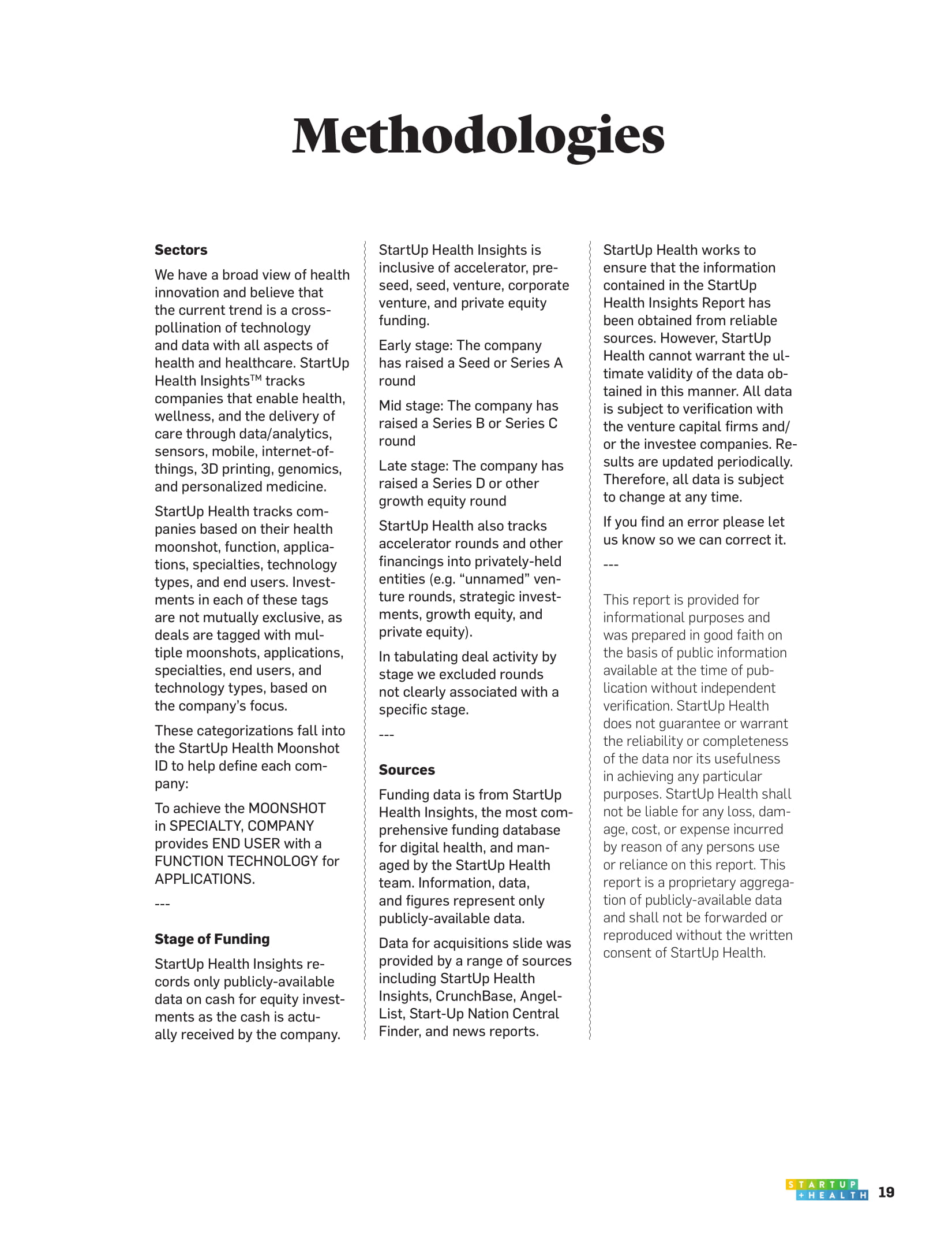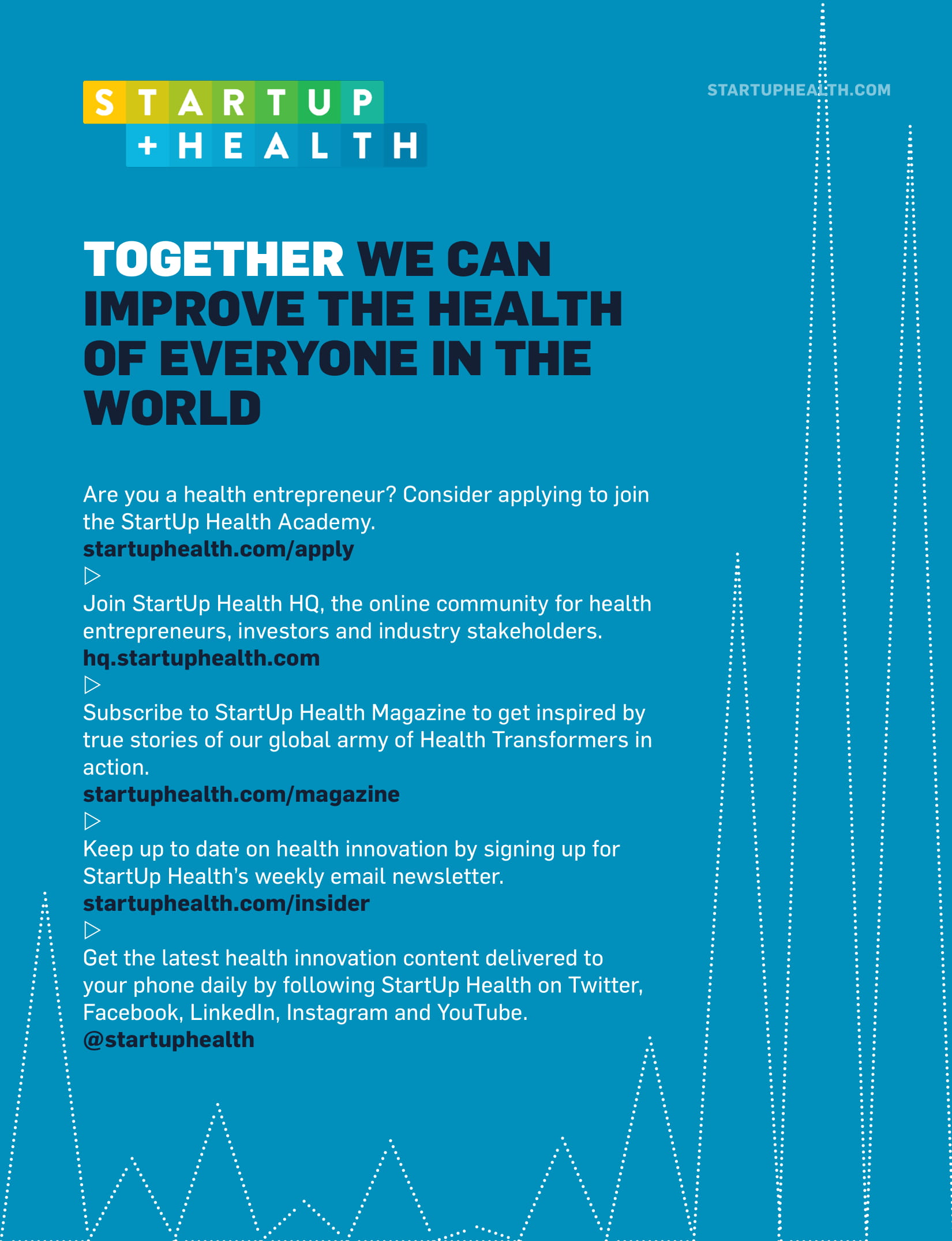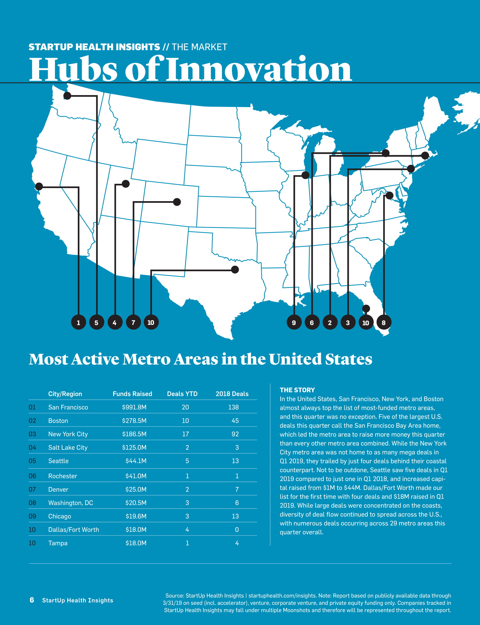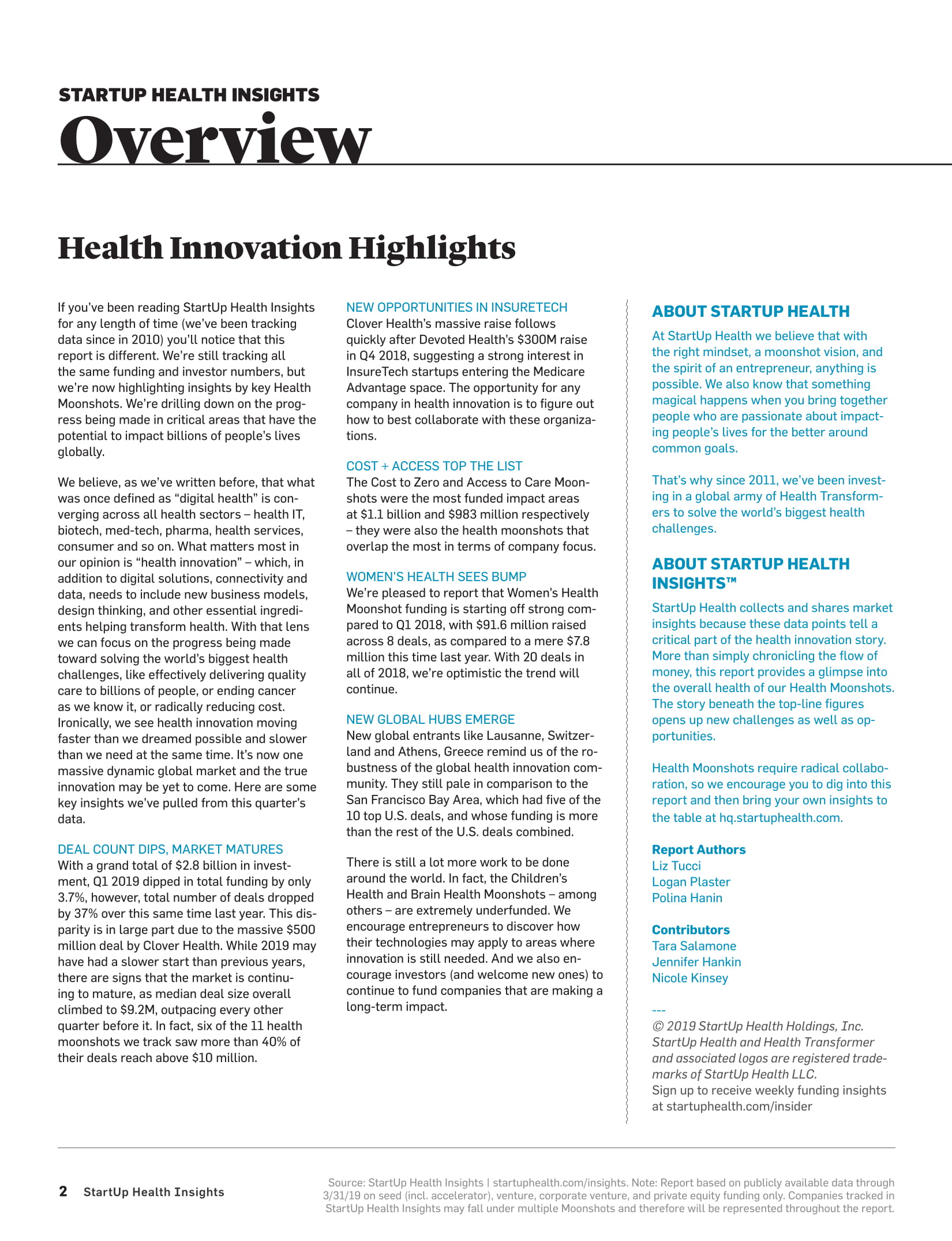 Startup Health发布了最新的“Q1 2019 医疗健康初创企业洞察”。“数字健康”正在融合所有医疗保健部门,如健康IT、生物技术、医疗技术、制药、医疗服务等等。Startup Health认为最重要的是“健康创新”,除了数字解决方案、联网和数据之外,还需要包括新的商业模式、设计思维以及其他有助于改变医疗健康的基本要素。通过这些,我们可以专注于解决世界上最大的健康挑战,例如有效地为数十亿人提供优质护理、治疗癌症,或者从根本上降低医疗成本。Startup Health认为健康创新的发展速度超过了我们的想想,但是也比我们需要的速度慢。它现在是一个充满活力的全球市场,真正的创新可能还未到来。