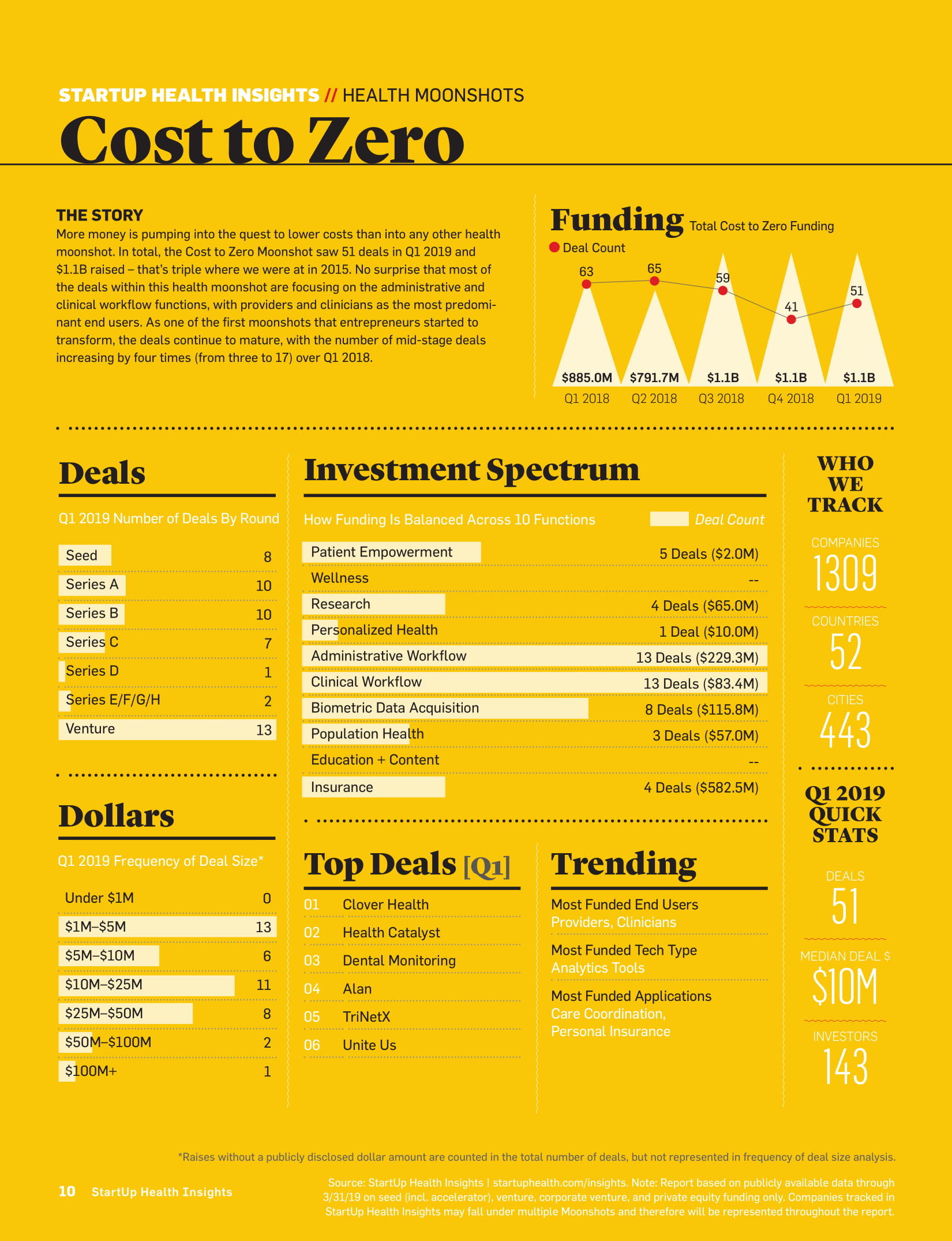 Cost to Zero和Access to Care Moonshots(Moonshots是一个需要激进解决方案和突破性技术来解决的巨大难题。因此,一个moonshot需要大量的资金,即便是该项目可能永远都不会有任何成果)是受投资影响最大的领域,分别为11亿美元和9.83亿美元。