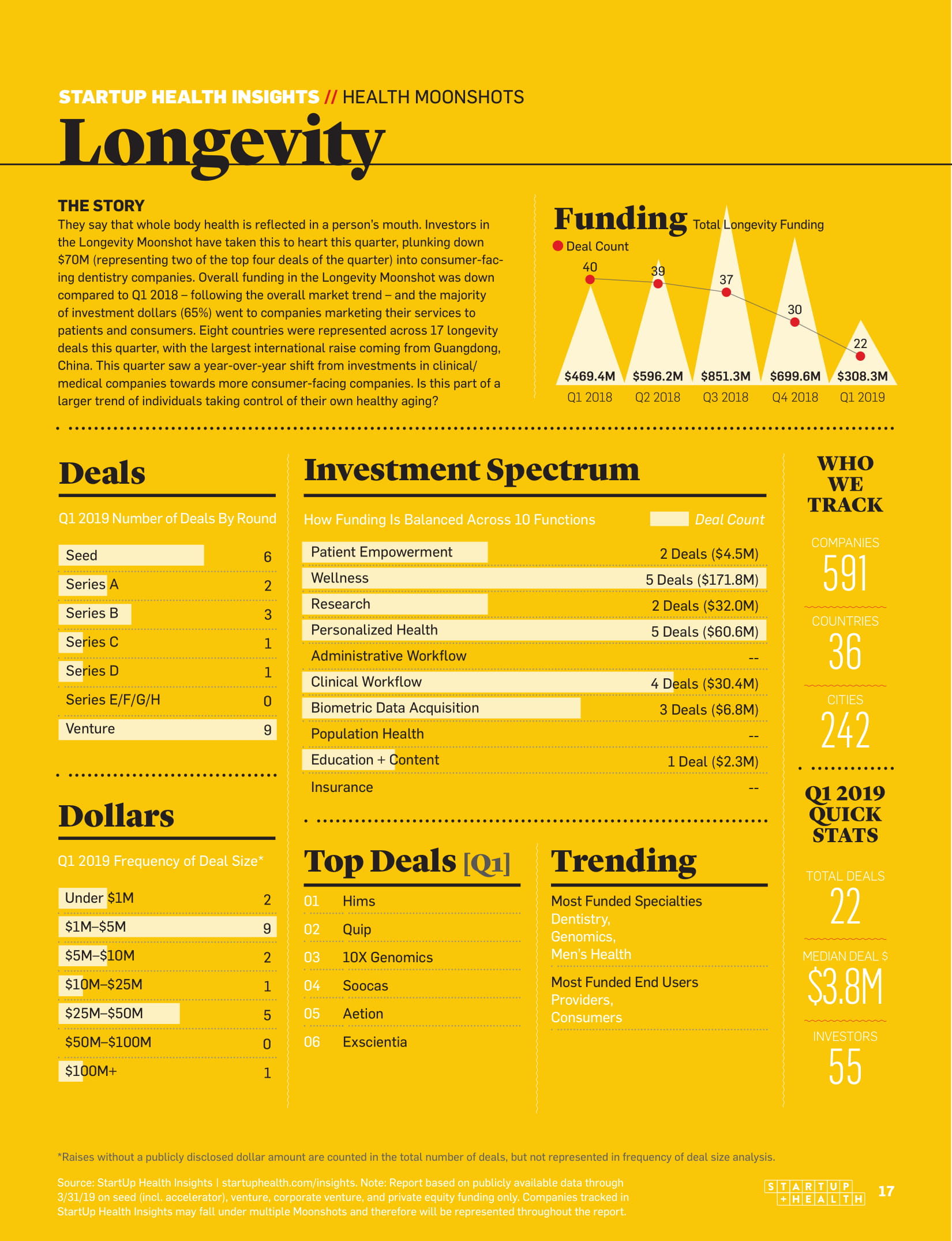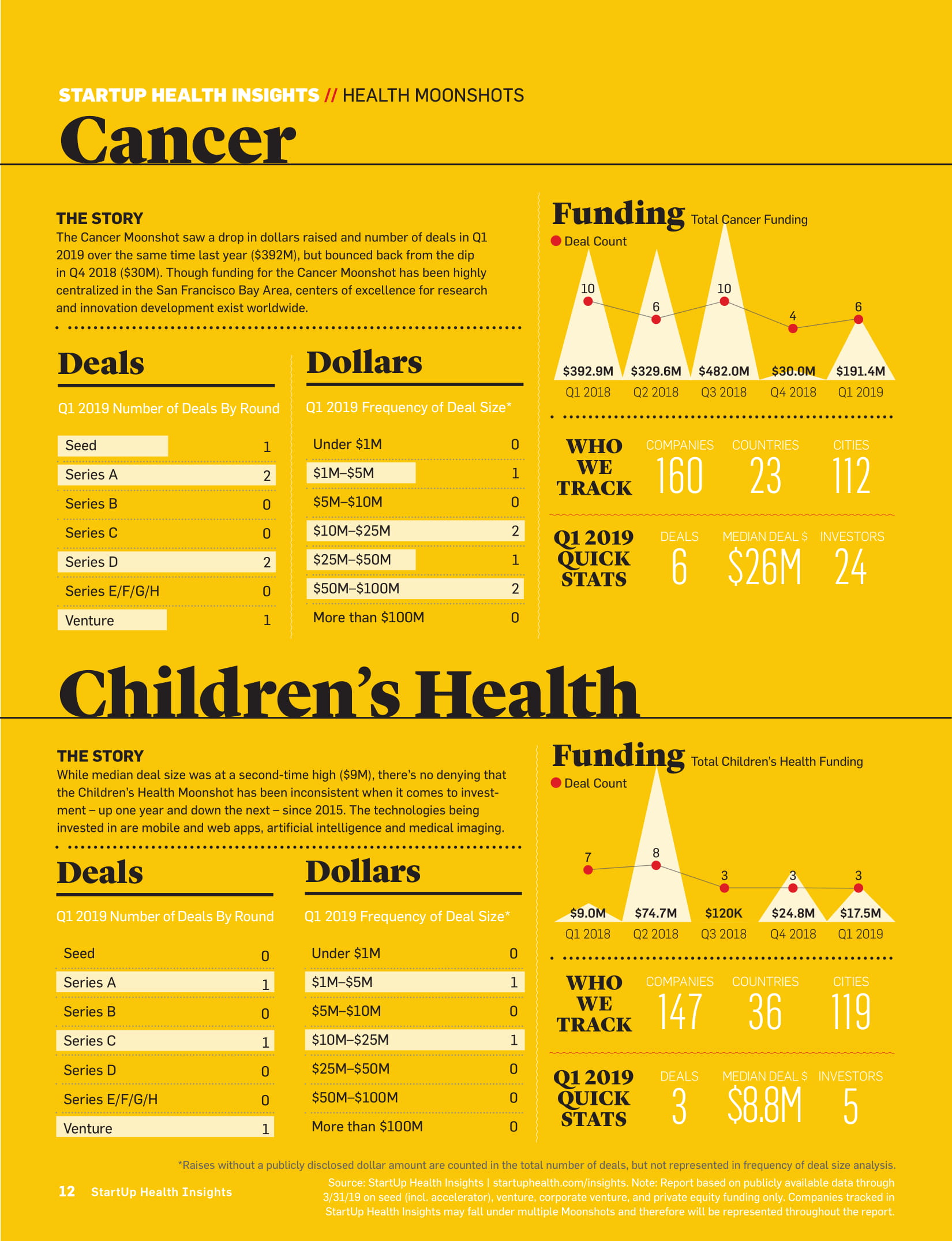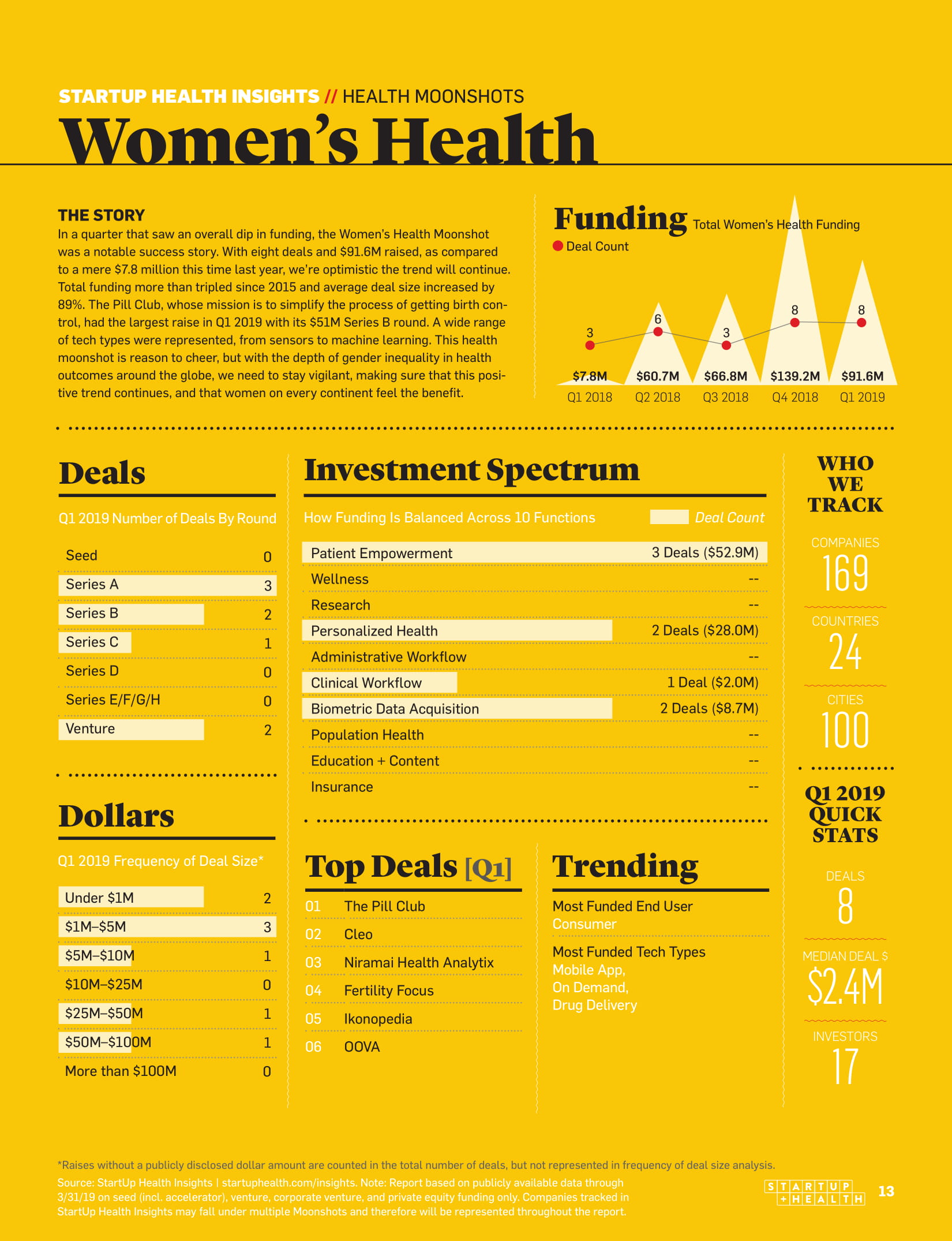 与2018年第一季度相比,女性健康Moonshot融资开始表现强劲,8笔交易中筹集了9160万美元,前一年同期只有780万美元。2018年该领域共有20笔交易。