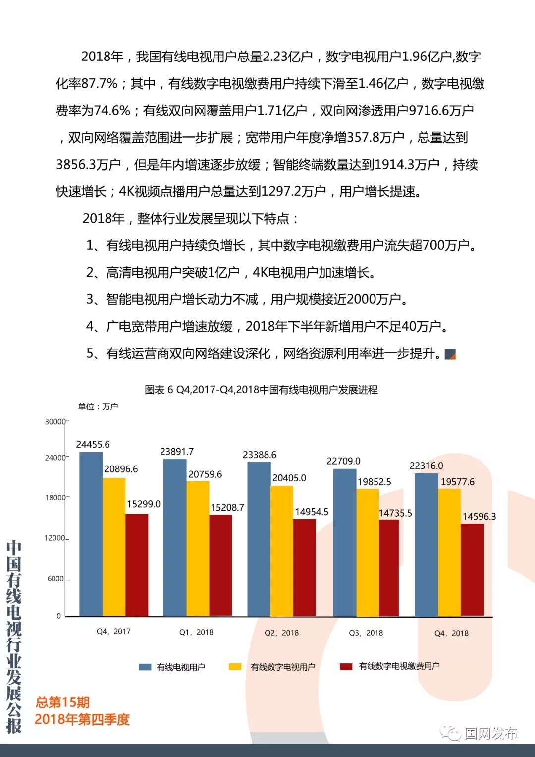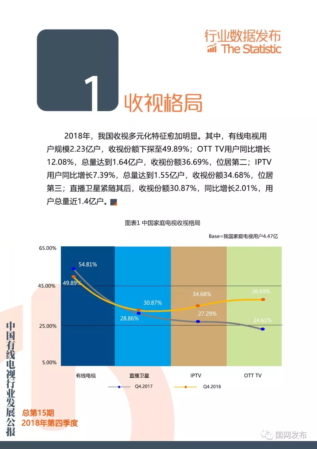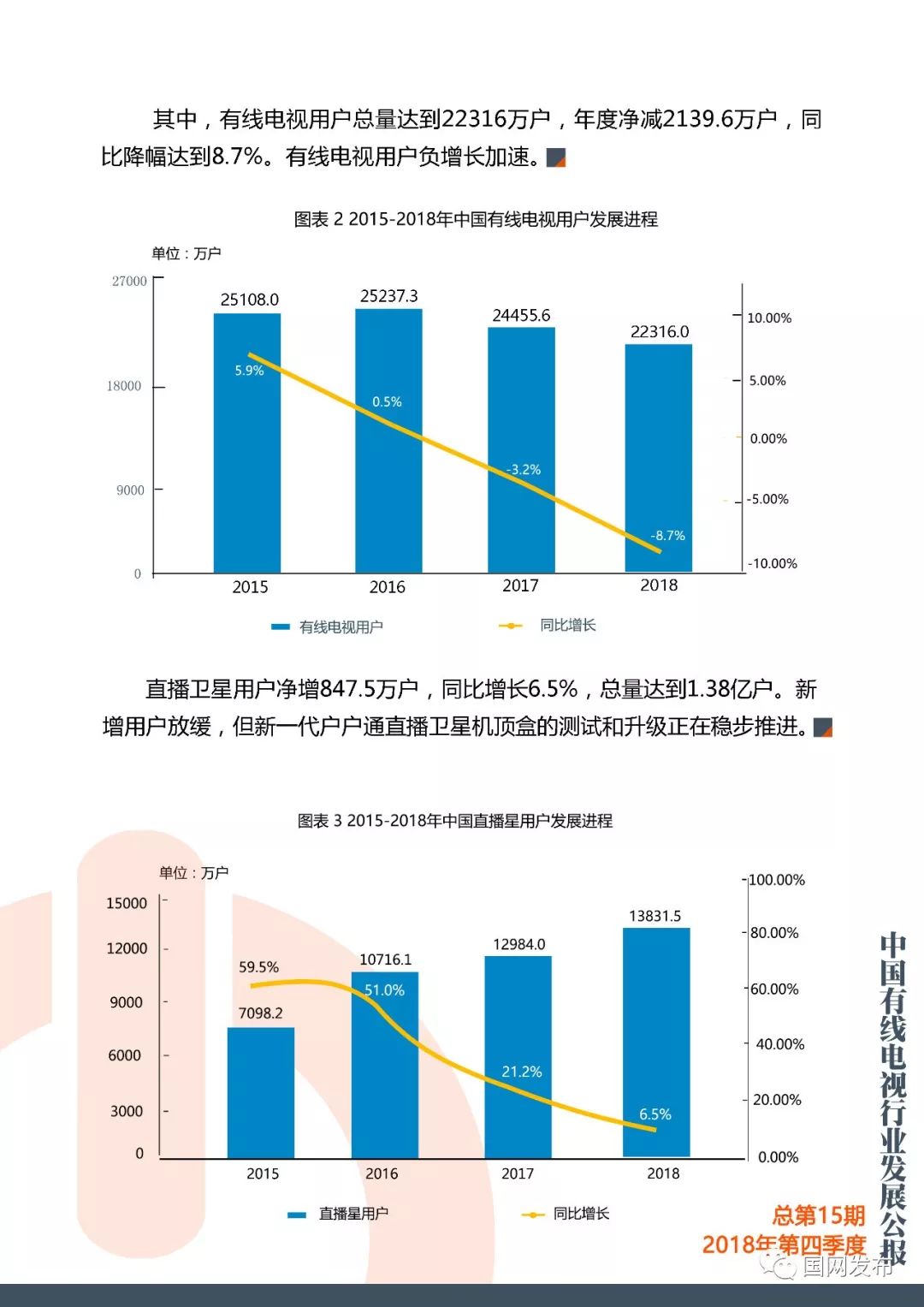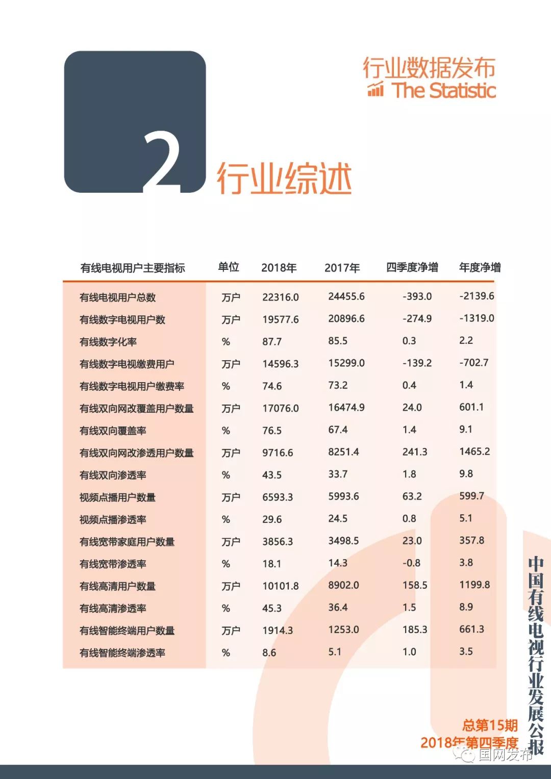国网:2018年第四季度中国有线电视行业发展公报 更多阅读:在中国,只抓一个权健是不够的Crunchbase:2018年中国初创企业已经获得938亿美元投资The Trade Desk:调查显示美国用户对有线电视失去兴趣美兰德:2015年4月省级卫视有线电视入网状况美兰德:2015年5月省级卫视有线电视入网状况Leichtman Research:2013年Q3付费电视订阅客户流失超过60万Convergence:2018年美国有线电视、卫星电视、电信电视收入1034亿美元eMarketer:2018年美国电视广告支出将缩减0.5%eMarketer:付费电视的市场份额越来越大,但有线电视的市场份额却略有下滑cg42:调查显示大多数消费者都准备抛弃他们的有线电视公司有线电视下一个威胁:广告费流向视频网站AYTM:传统电视渐行渐远,流媒体收视增长Convergence:1/5的加拿大家庭只使用无线服务皮尤研究中心:2012年新闻媒体现状研究报告在线新闻浏览削减了有线电视收视率