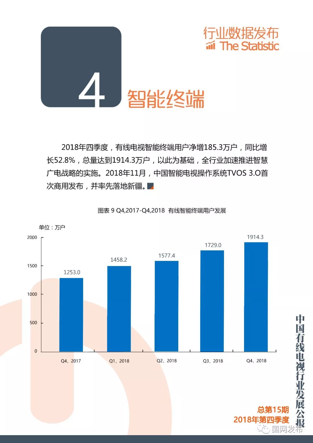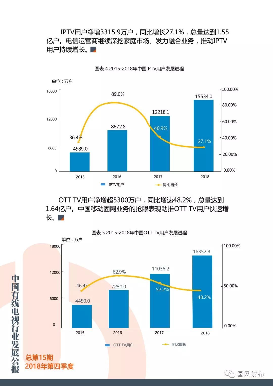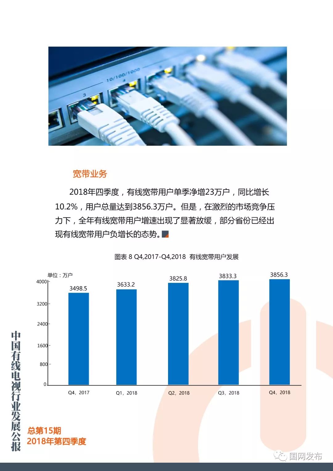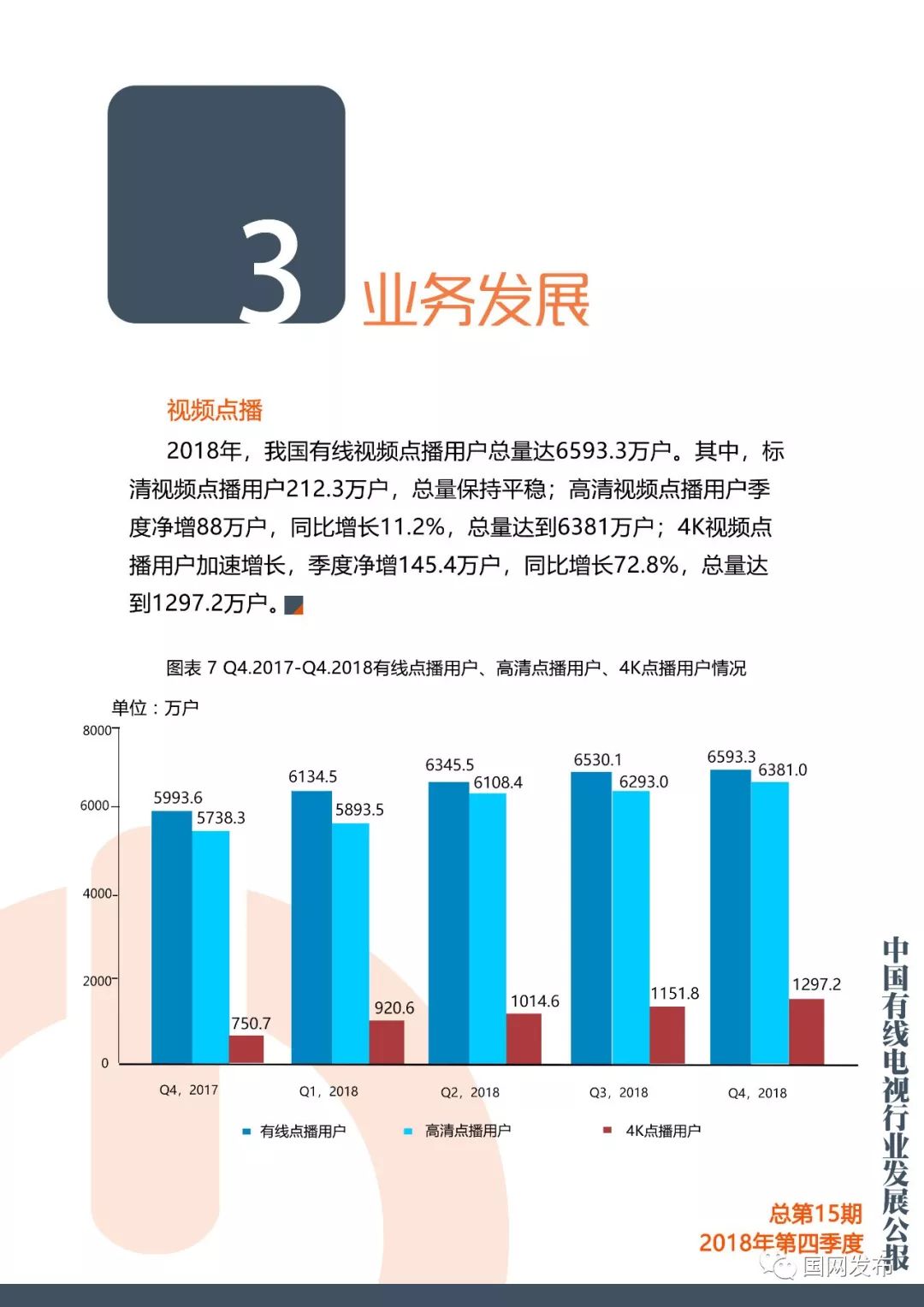 国网:2018年第四季度中国有线电视行业发展公报 更多阅读:在中国,只抓一个权健是不够的Crunchbase:2018年中国初创企业已经获得938亿美元投资The Trade Desk:调查显示美国用户对有线电视失去兴趣美兰德:2015年4月省级卫视有线电视入网状况美兰德:2015年5月省级卫视有线电视入网状况Leichtman Research:2013年Q3付费电视订阅客户流失超过60万Convergence:2018年美国有线电视、卫星电视、电信电视收入1034亿美元eMarketer:2018年美国电视广告支出将缩减0.5%eMarketer:付费电视的市场份额越来越大,但有线电视的市场份额却略有下滑cg42:调查显示大多数消费者都准备抛弃他们的有线电视公司有线电视下一个威胁:广告费流向视频网站AYTM:传统电视渐行渐远,流媒体收视增长Convergence:1/5的加拿大家庭只使用无线服务皮尤研究中心:2012年新闻媒体现状研究报告在线新闻浏览削减了有线电视收视率