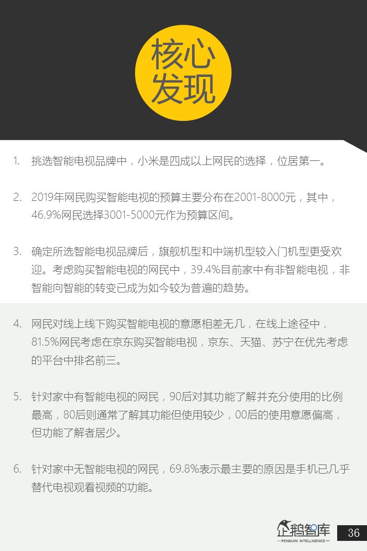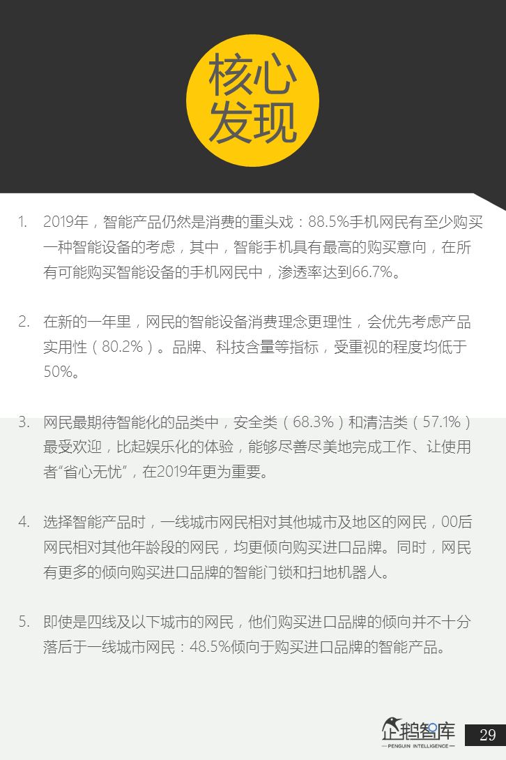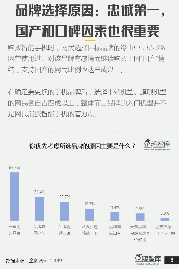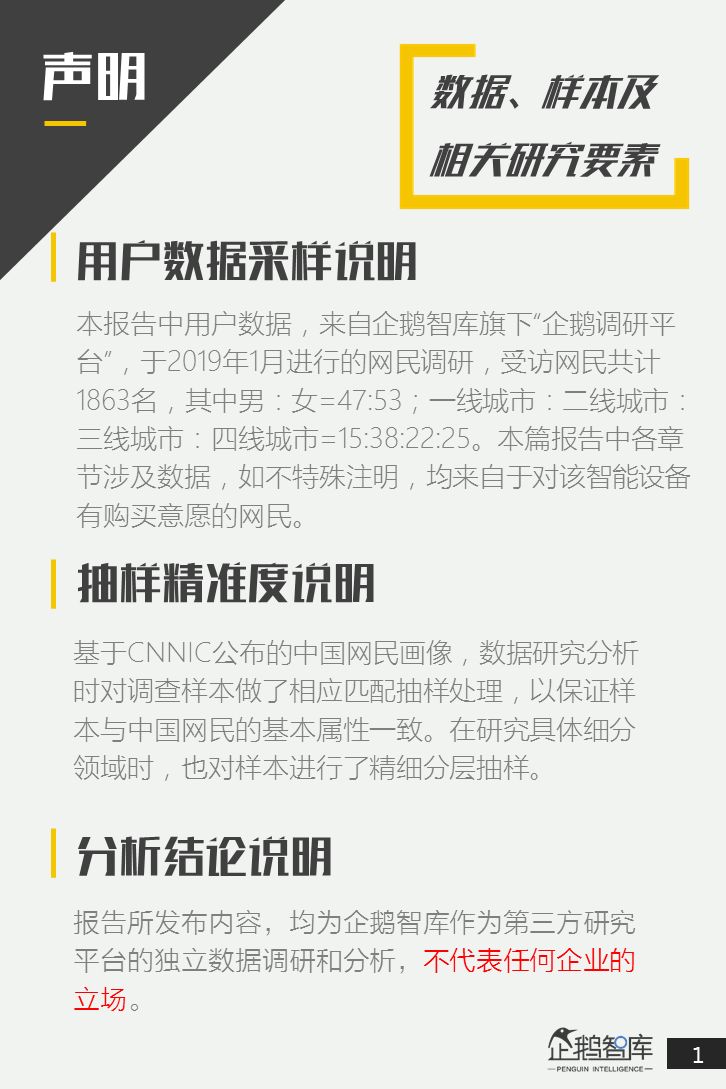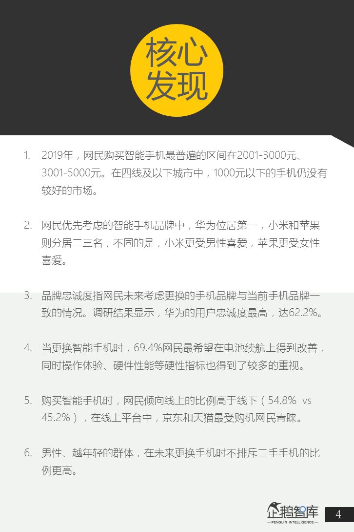 为了更好的了解中国网民,在2019年的智能手机和智能硬件消费意愿,企鹅智库通过旗下企鹅调研平台,结合中国网民画像进行了精准调研,并最终发布了这份《智能手机&智能硬件:2019中国网民购买力报告》。