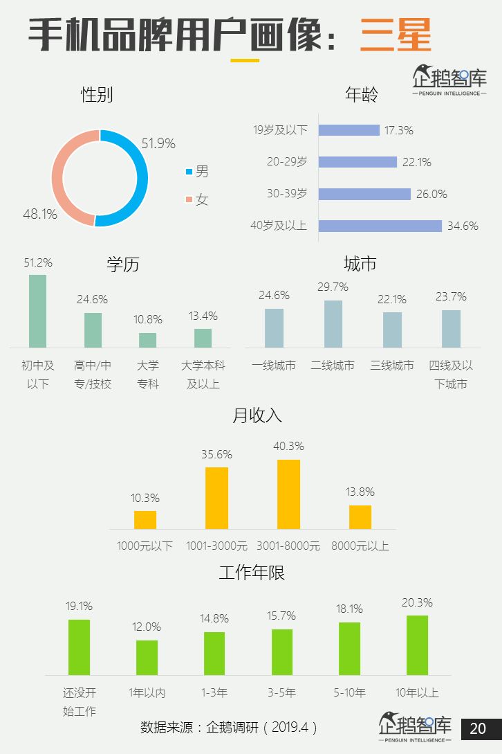 华为手机中老年用户占比更高;苹果和小米用户分布,则在中青年中更为突出;OPPO和vivo的用户画像偏重更为年轻的20-29岁。 -