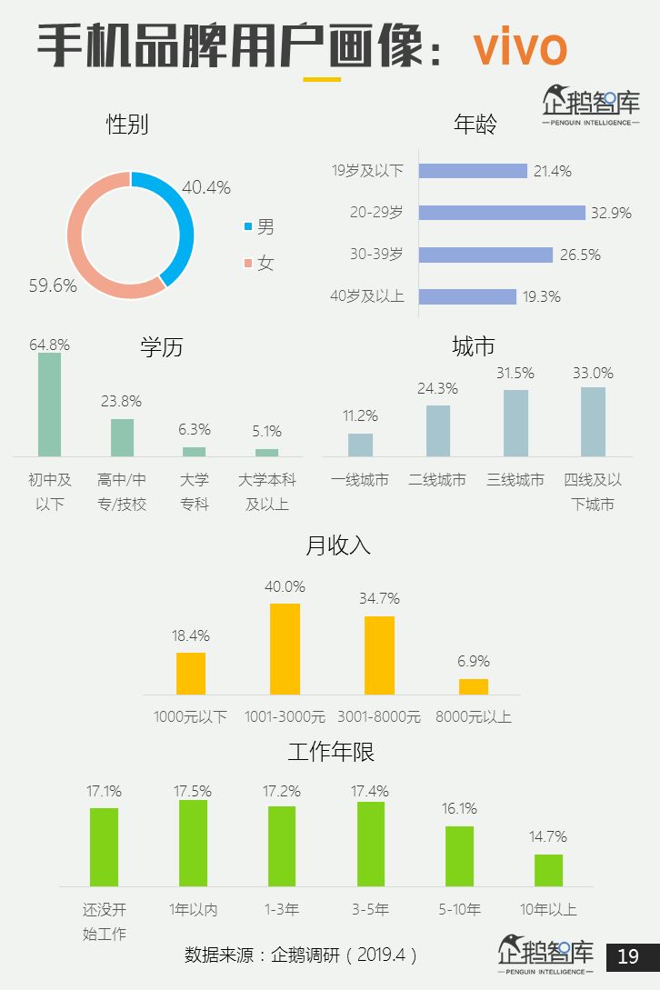 地域方面,苹果一线城市用户占比最高;小米二线城市和华为的三线城市分别是各自的高点;OPPO和vivo在低线城市中占比更高。 -