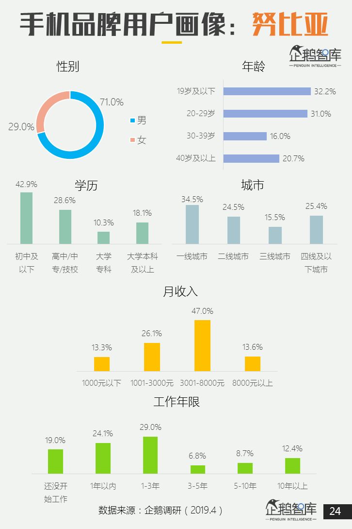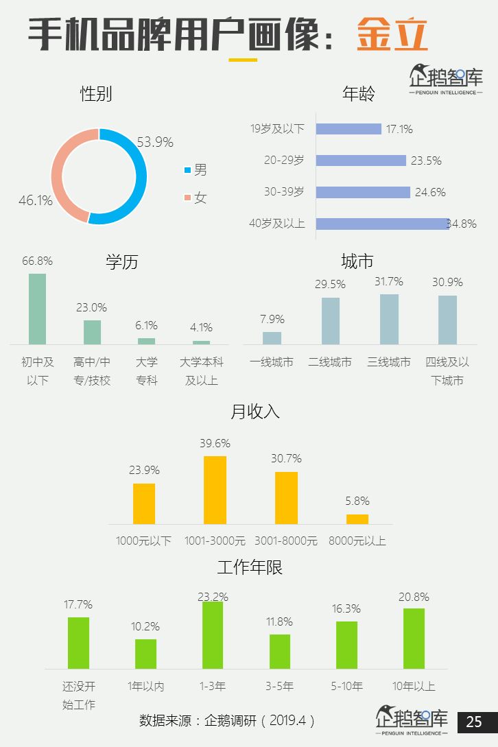 在其他手机品牌中,三星、诺基亚、金立拥有更高占比的中老年用户;锤子、一加、努比亚拥有更高的大学以上学历用户。 -