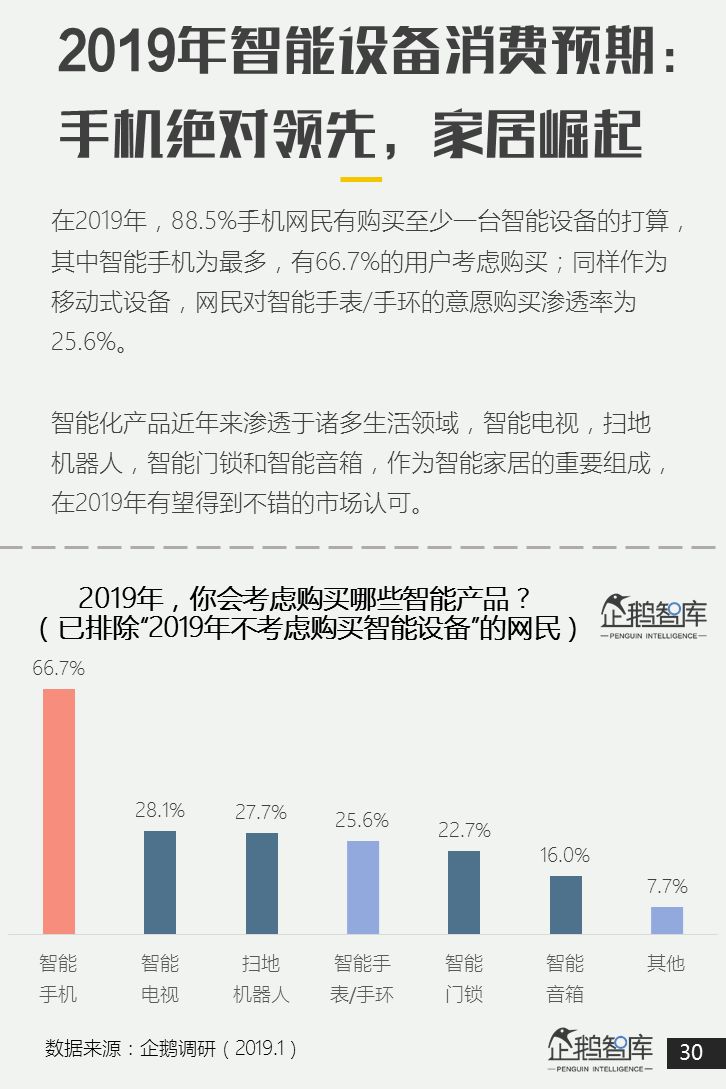 88.5%手机网民在2019年,有至少购买一种智能设备的考虑。 -