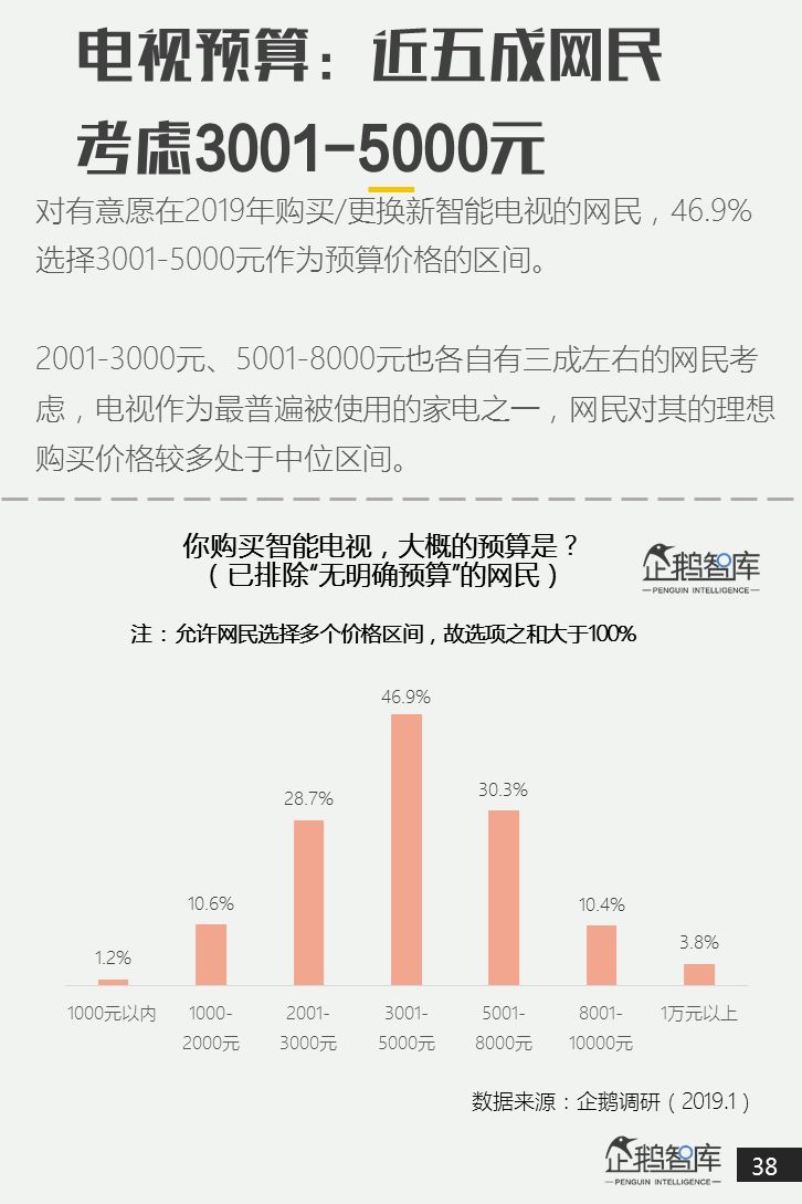 2019年网民购买智能电视的预算主要分布在2001-8000元,其中,46.9%网民选择3001-5000元作为预算区间。 -