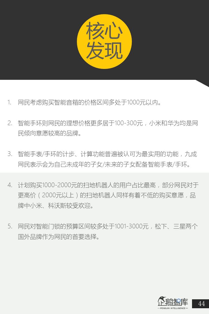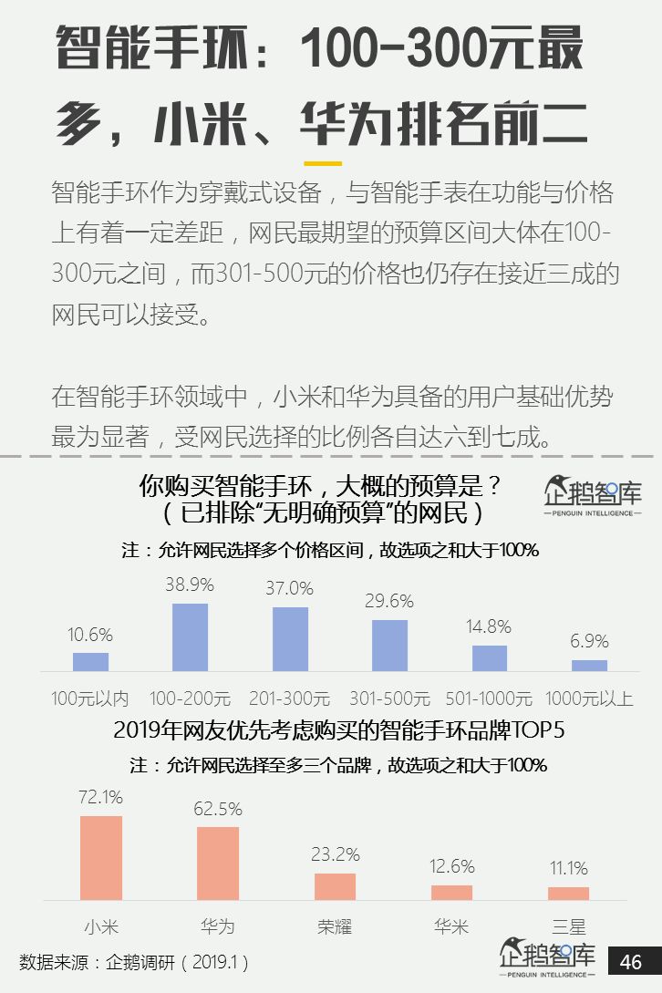 智能手环则网民的理想价格更多居于100-300元,小米和华为均是网民倾向意愿较高的品牌。 -