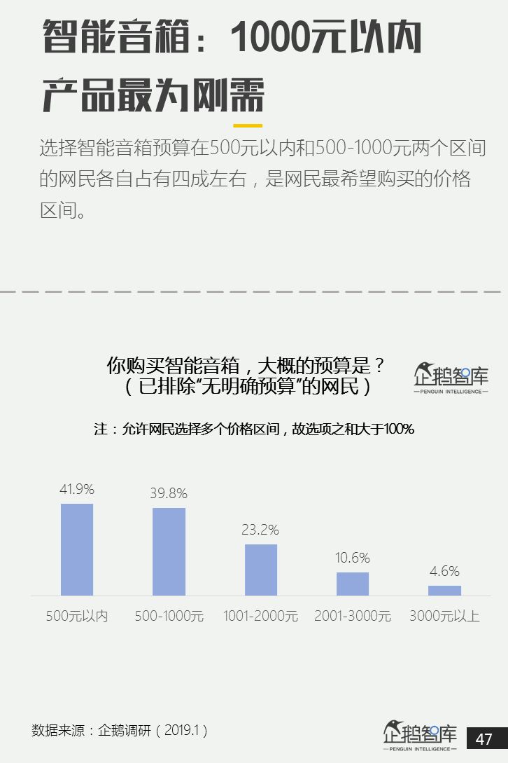 网民考虑购买智能音箱的价格区间多处于1000元以内。 -