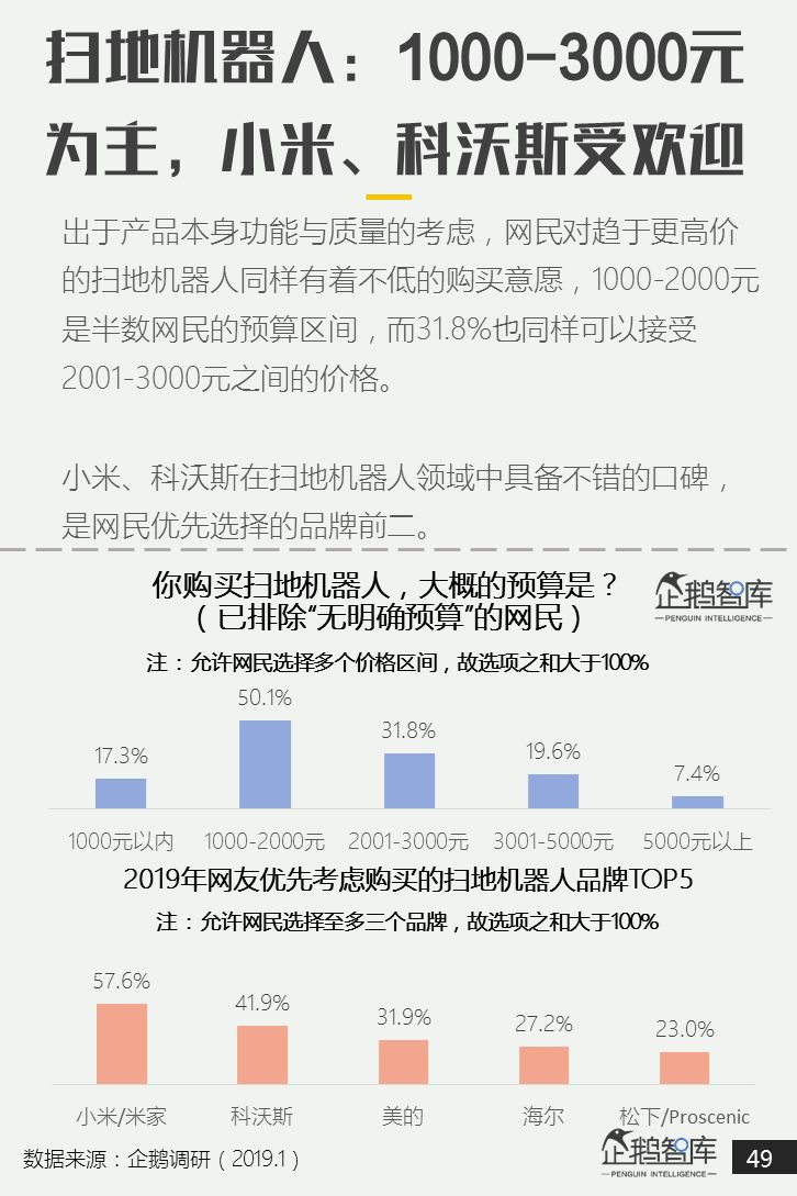计划购买1000-2000元的扫地机器人的用户占比最高,品牌中小米、科沃斯较受欢迎。 -