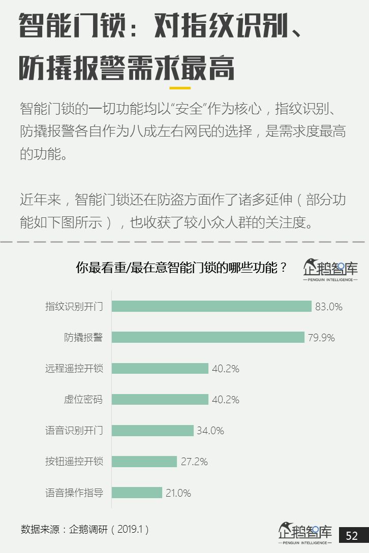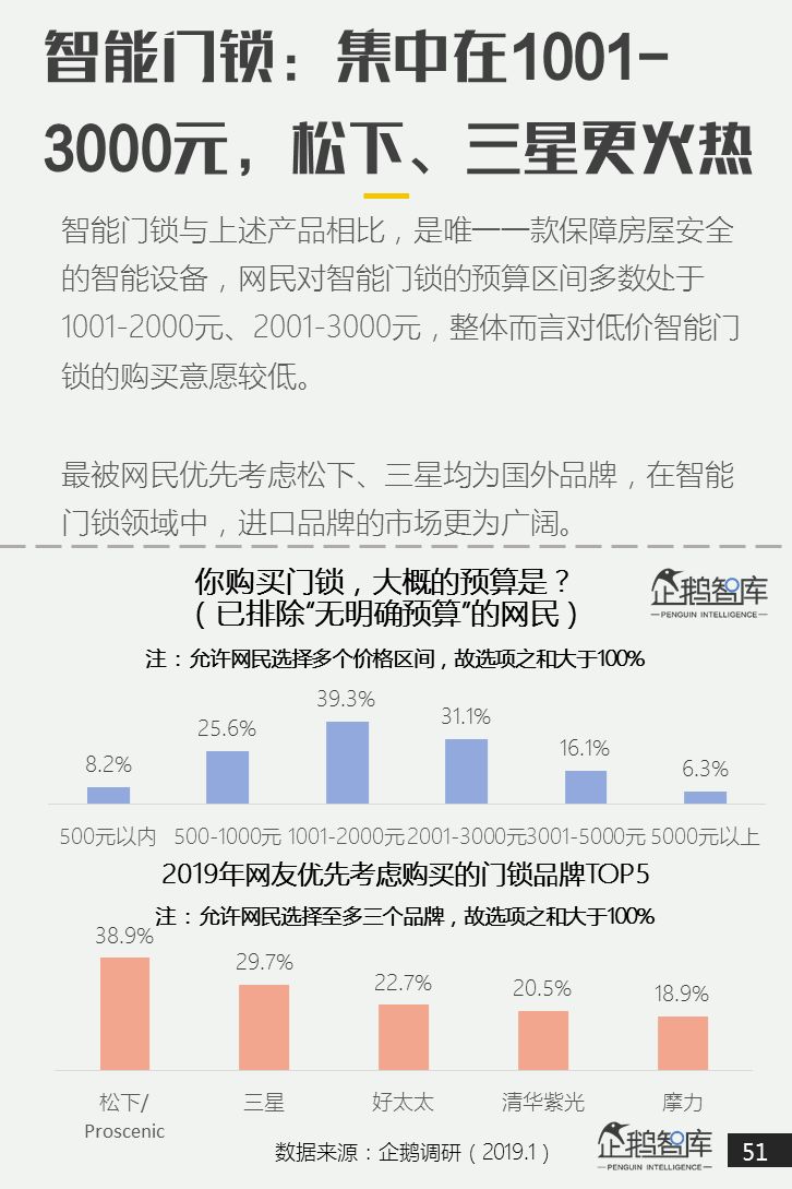 网民对智能门锁的预算区间较多处于1001-3000元,松下、三星两个国外品牌作为网民的首要选择。