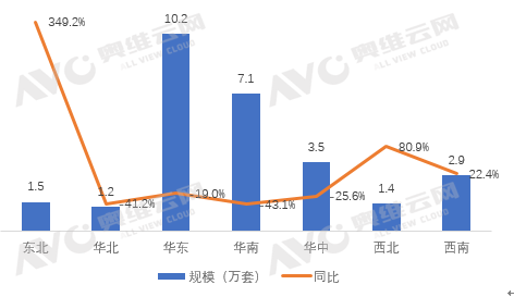 2019年1-2M精装修卫浴市场分区域市场规模及同比