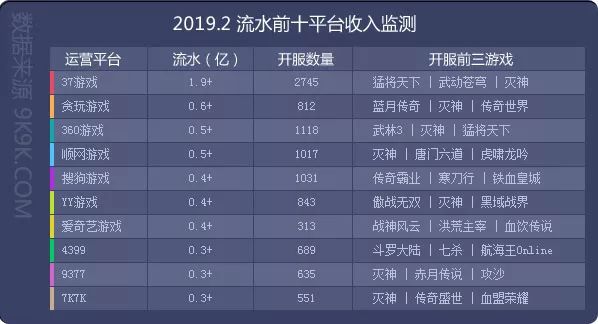 点评:本月榜单平台流水收入情况与上月相比变化不大;37游戏依旧坐稳榜首之位,实现开服总数与流水收益双丰收。