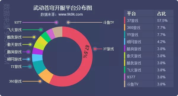 点评:本月《武动苍穹》开服总数与上月基本持平,新增分布占比平台傲天游戏、斗鱼TV等一线平台。