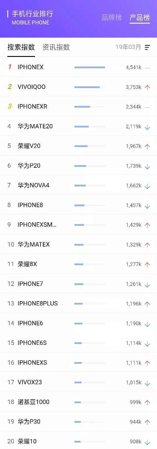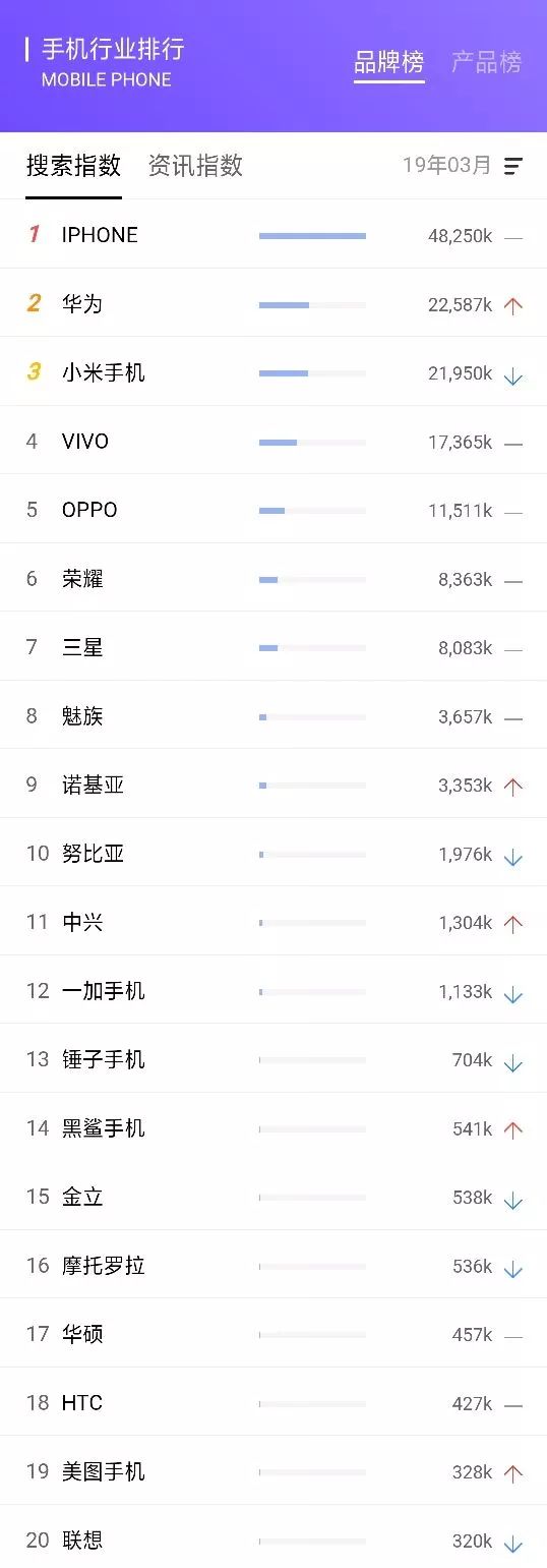 在3月的榜单中,iPhone位列第1名,华为、小米手机、vivo和oppo位列第2-第5名,第6-10名分别为荣耀、三星、魅族、诺基亚和努比亚。