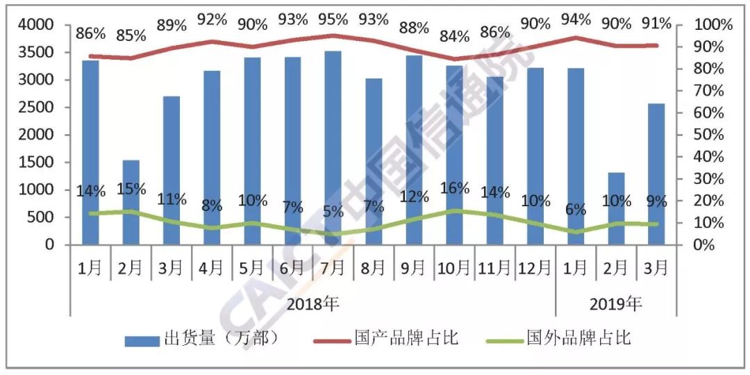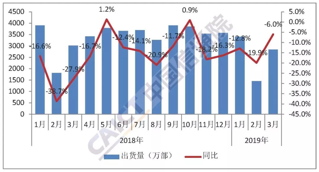 中国信通院:2019年3月国内手机市场运行分析报告 一、国内手机市场总体情况 国内手机市场总体出货量。2019年3月,国内手机市场总体出货量2837.3万部,同比下降6.0%,其中4G手机2697.8万部,同比下降3.9%,在同期手机出货量中占比95.1%,另有2G、3G手机出货量分别为138.7万部、0.8万部; 2019年1-3月,国内手机市场总体出货量7693.1万部,同比下降11.9%,其中4G手机7331.7万部,同比下降10.5%,在同期手机出货量中占比95.3%,另有2G、3G手机出货量分别为357.0万部、4.5万部。 图1 国内手机市场出货量情况 国内手机市场上市新机型数量。2019年3月,上市新机型52款,同比下降35.0%,上市新机型中含2G手机11款、4G手机41款;2019年1-3月,上市新机型125款,同比下降39.3%,上市新机型中含2G手机24款、3G手机1款,4G手机100款。 图2 国内手机市场上市新机型数量 二、国内手机市场国内外品牌构成 2019年3月,国产品牌手机出货量2568.9万部,同比下降4.8%,占同期手机出货量的90.5%;上市新机型47款,同比下降39.7%,占同期手机上市新机型数量的90.4%。2019年1-3月,国产品牌手机出货量7085.7万部,同比下降6.6%,占同期手机出货量的92.1%;上市新机型112款,同比下降41.1%,占同期手机上市新机型数量的89.6%。 图3 国产品牌手机出货量及占比 三、国内智能手机发展情况 智能手机出货量。2019年3月,智能手机出货量2693.6部,同比下降4.1%,占同期手机出货量的94.9%,其中Android手机在智能手机中占比92.1%。2019年1-3月,智能手机出货量7307.2万部,同比下降10.7%,占同期手机出货量的95.0%,其中Android手机在智能手机中占比92.4%。 图4 2018年/2019年国内智能手机出货量及增长趋势 智能手机上市新机型数量。2019年3月,智能手机上市新机型40款,同比下降41.2%,占同期手机上市新机型数量的76.9%,其中支持Android操作系统的手机40款。2019年1-3月,智能手机上市新机型98款,同比下降38.0%,占同期上市新机型数量的78.4%,其中支持Android操作系统的手机98款。 更多阅读:中国信通院:2022年8月国内手机市场运行分析中国信通院:2018年10月国内手机市场运行分析报告中国信通院:2023年10月国内手机市场运行分析中国信通院:2024年5月国内手机市场运行分析报告中国信通院:2023年4月国内手机市场运行分析中国信通院:2023年6月国内手机市场运行分析中国信通院:2021年5月国内手机市场运行数据分析中国信通院:2023年1月国内手机市场运行分析中国信通院:2020年8月国内手机市场运行分析报告中国信通院:2020年9月国内手机市场运行分析报告中国信通院:2020年2月国内手机市场运行分析报告中国信通院:2019年9月国内手机市场运行分析报告中国信通院:2019年8月国内手机市场运行分析报告中国信通院:2022年10月中国市场手机出货量2435.6万部 同比下降27.5%中国信通院:2021年9月国内手机市场运行分析报告