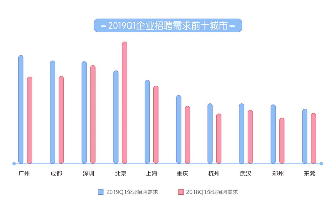其中,企业招聘需求最大的城市为广州,同比2018年一季度增长24.95%,受到粤港澳大湾区发展规划政策影响,广州城市建设加快,企业招聘需求大。