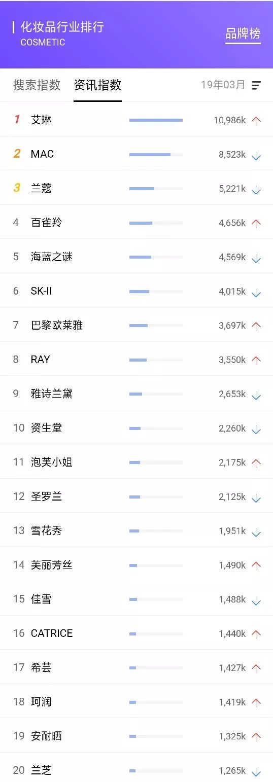 在3月的资讯榜单中,艾琳位列第1名,MAC、兰蔻、百雀羚和海蓝之谜位列第2-第5名,第6-10名分别为SK-II、巴黎欧莱雅、RAY、雅诗兰黛和资生堂。