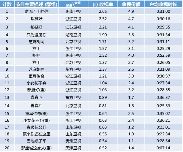 继北京卫视《娘道》及湖南卫视《知否》之后,3月电视剧市场再次迎来一款高话题高关注剧目,即浙江卫视、江苏卫视同步播出的家庭情感题材剧目《都挺好》。北京卫视《芝麻胡同》3月收官,为榜单排名第五名。贵州卫视《雪地娘子军》3月仍然保持在剧目排名TOP20。