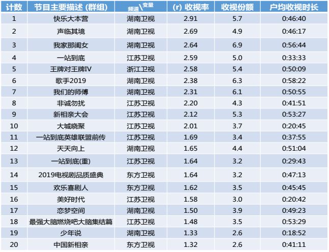 综艺节目方面,排名榜单由五大卫视承包;但从数据绝对值来看,节目间竞争十分激烈,前后差距并不十分明显。湖南卫视在综艺榜单TOP5中占据3席,常规综艺节目《快乐大本营》占据榜首,《声临其境》、《我家那闺女》紧跟其后,江苏卫视节目《一站到底》及浙江卫视《王牌对王牌IV》分列第四、第五名。湖南卫视之外,江苏卫视在榜单TOP10中占据4席,《非诚勿扰》、《新相亲大会》及《大城晓聚》均进入TOP10。