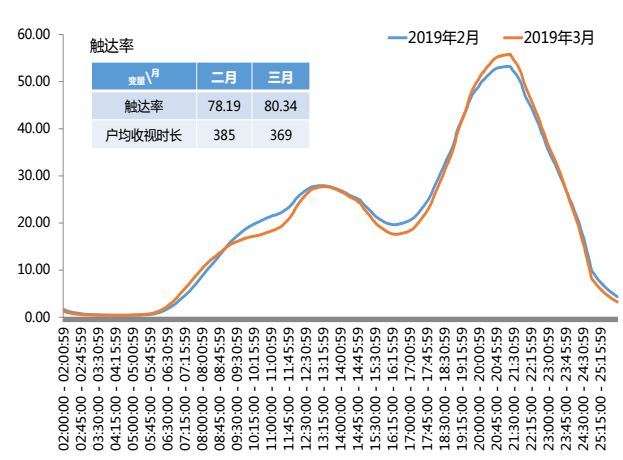 3月,整体电视市场进入相对平稳的状态。分时段来看,相较于2月,白天个别时段触达略有下降,但晚间有较为明显的提升。全天来看,整体呈现上升的态势,且触达高峰没有发生明显的移动。但不同于2月有春节假期红利,3月进入平稳的工作日阶段,户均收视时长较2月略有下降。