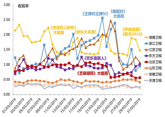 观察晚间TOP10卫视频道分日收视情况,浙江卫视、江苏卫视凭借电视剧目《都挺好》挣得一席之地;湖南卫视则主要依靠口碑季播综艺节目据守地盘;TOP3卫视之外,东方卫视有老牌喜剧节目《欢乐喜剧人》支持门庭;北京卫视则有剧目《芝麻胡同》。3月晚间卫视竞争局面呈现出了难得的激烈和胶着。