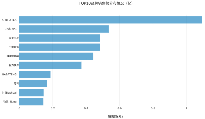 这些品牌依次是科大讯飞、小米、未来小七、小帅智能、PUDDING、智力快车、巴巴腾(BABATENG)、好帅、大帅(Dashuai)和物灵(Ling)。其中科大讯飞凭借其在语音识别领域的优势领跑行业。