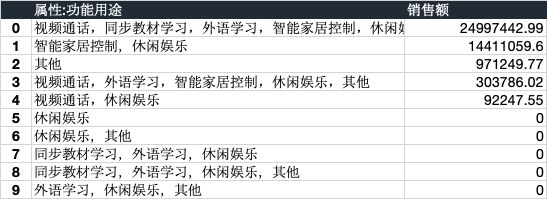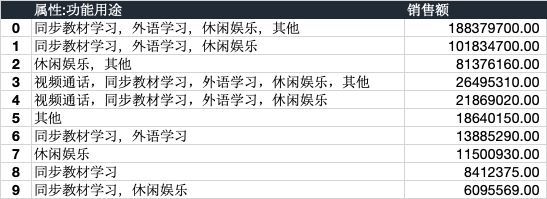 我们分别对0~1000元和大于10000元的智能教育机器人的功能用途进行分析。下面是0~1000元商品的销售额TOP10功能用途: