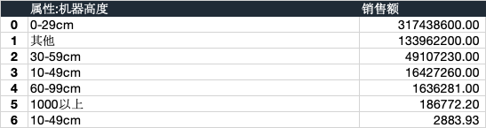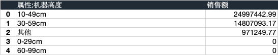 下表是0~1000元智能教育机器人在不同机器高度上的销售额情况,我们发现销售额最高的机器高度是0-29cm。