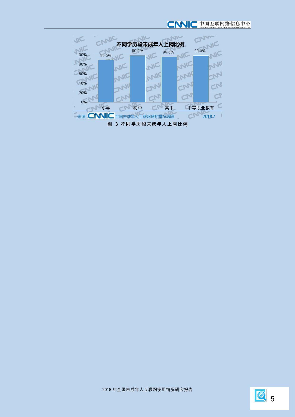 从各学历段情况看,小学、初中、高中和中职学生上网比例分别达到89.5%、99.4%、96.3%和99.0%。