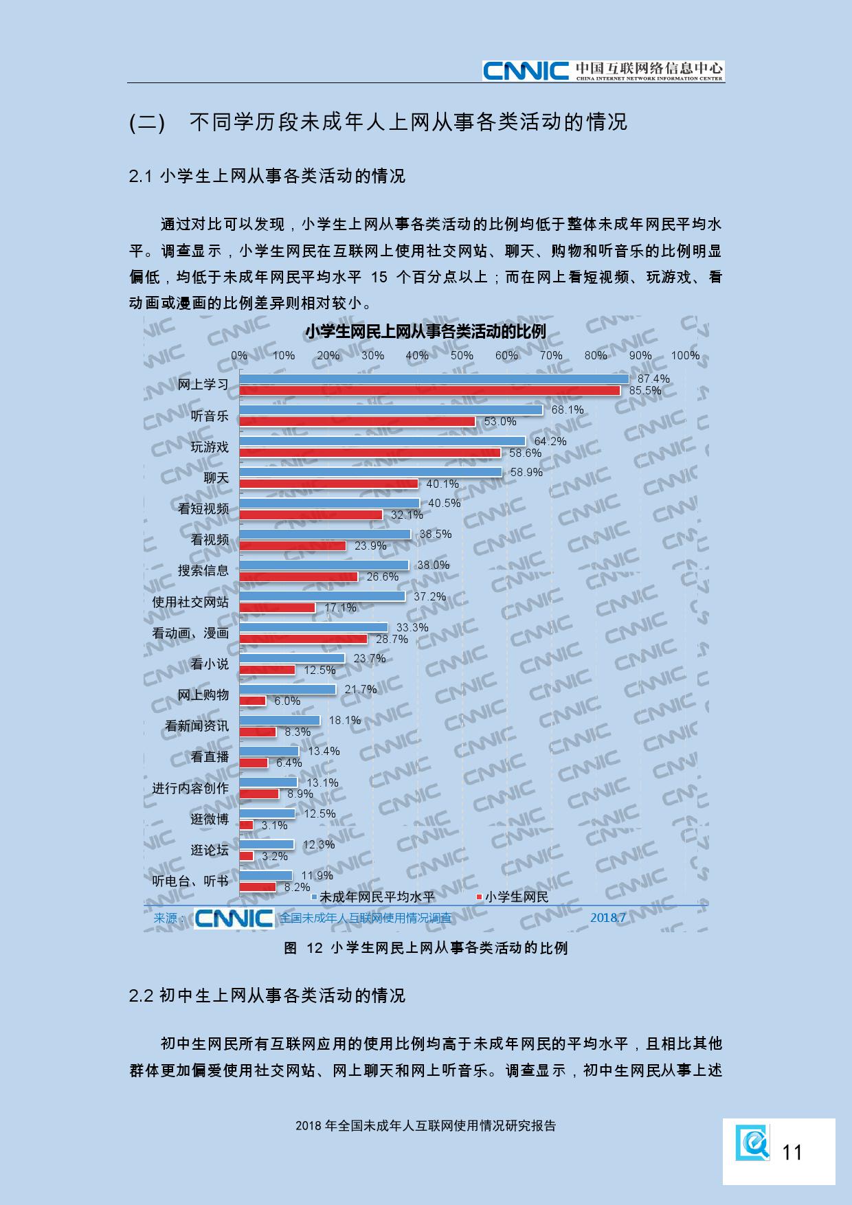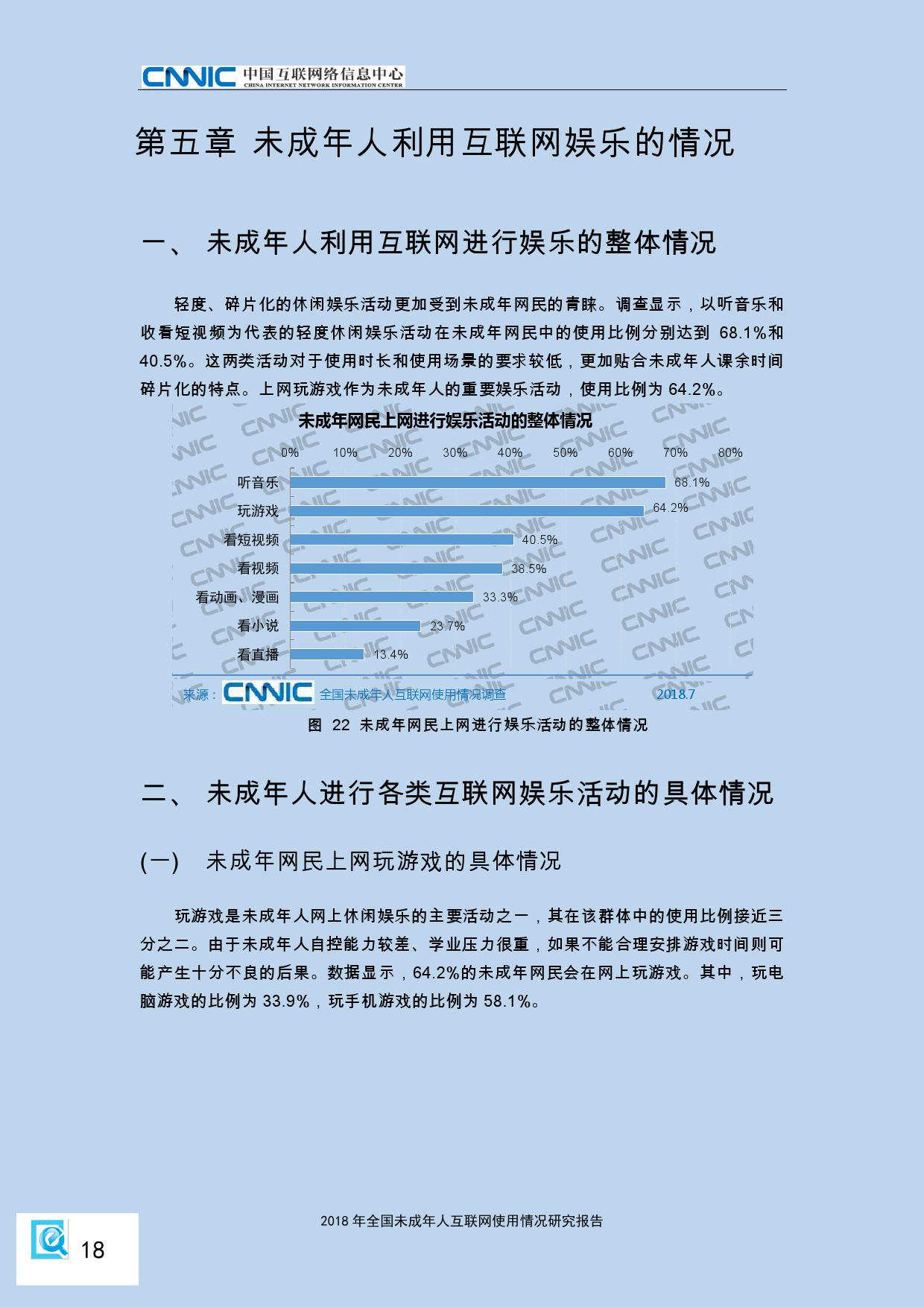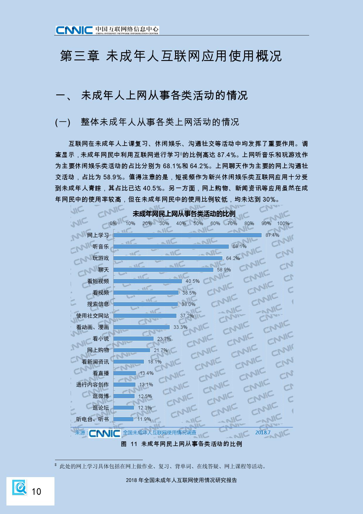 未成年人上网,排在前几位的是利用互联网学习(87.4%)、听音乐(68.1%)、玩游戏(64.2%)、聊天(58.9%)。