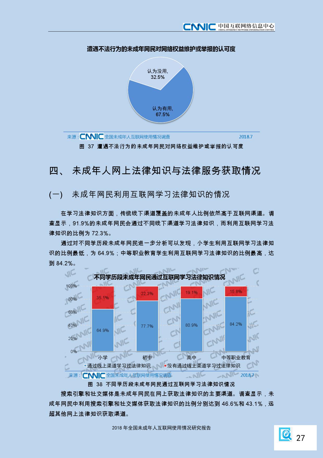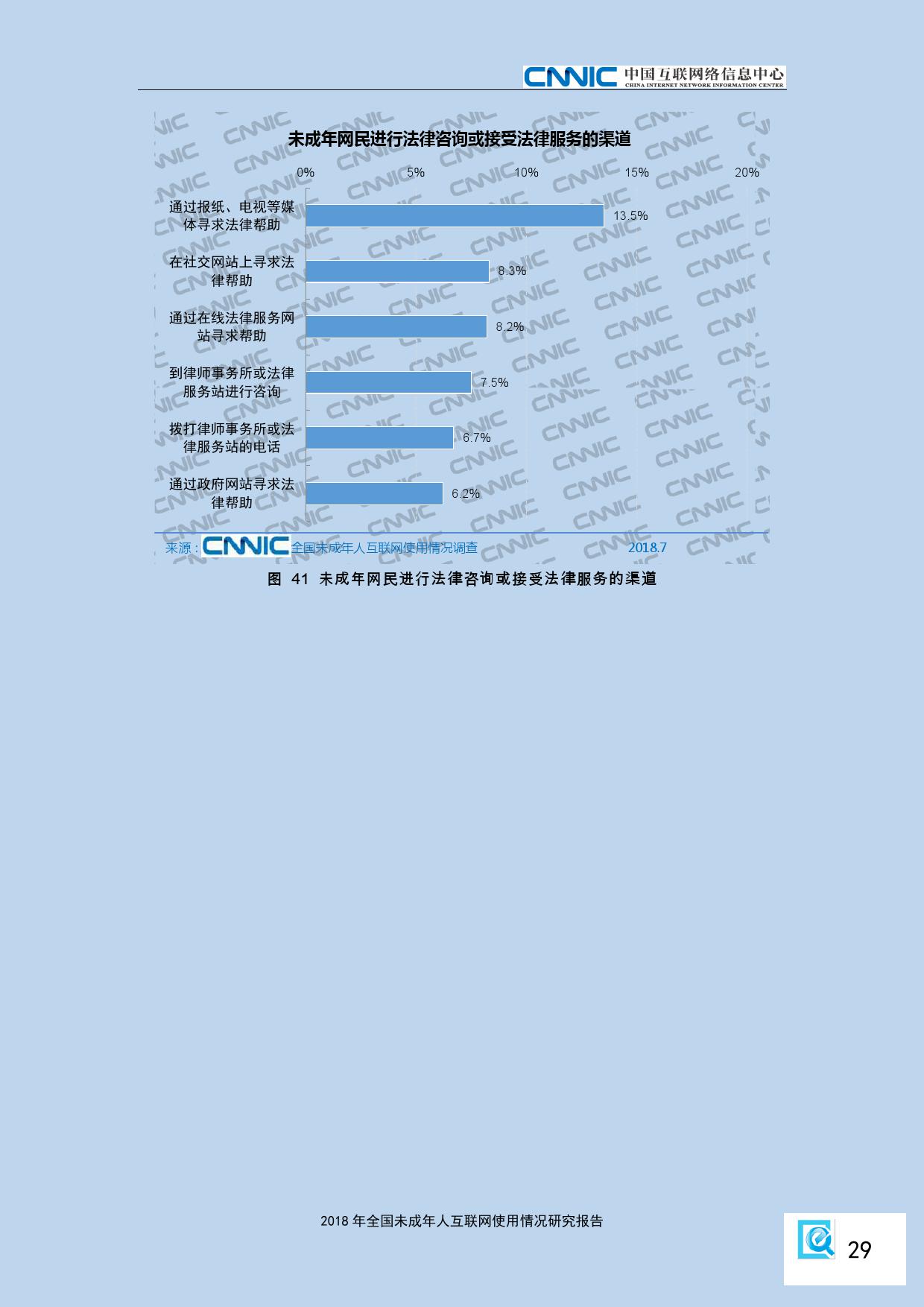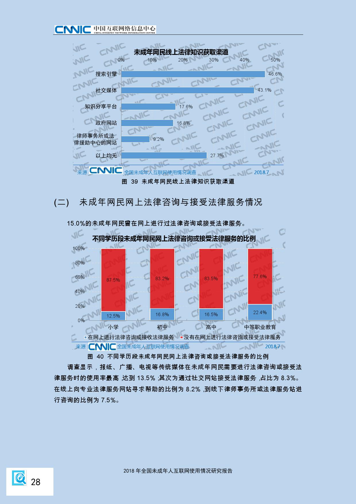 曾通过网络进行法律咨询或接受法律服务的未成年人比例只有15%,未成年网民利用互联网进行自我保护的应用水平较低。