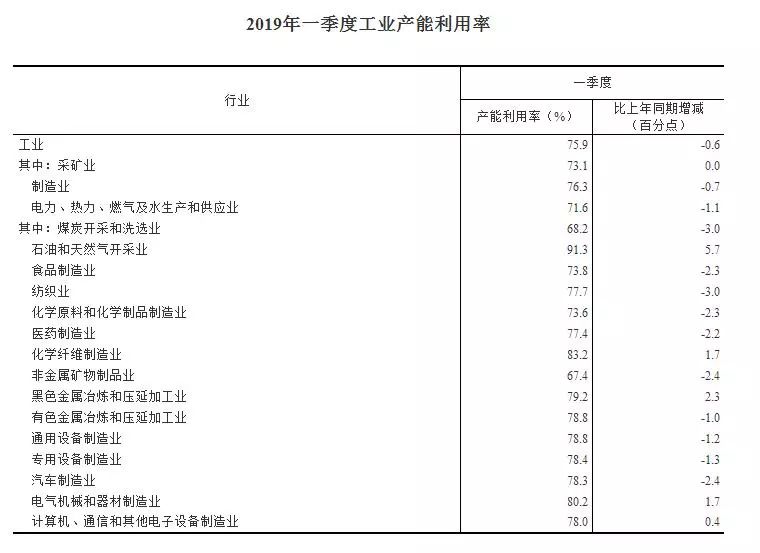 2019年一季度,全国工业产能利用率为75.9%,比上年同期下降0.6个百分点。