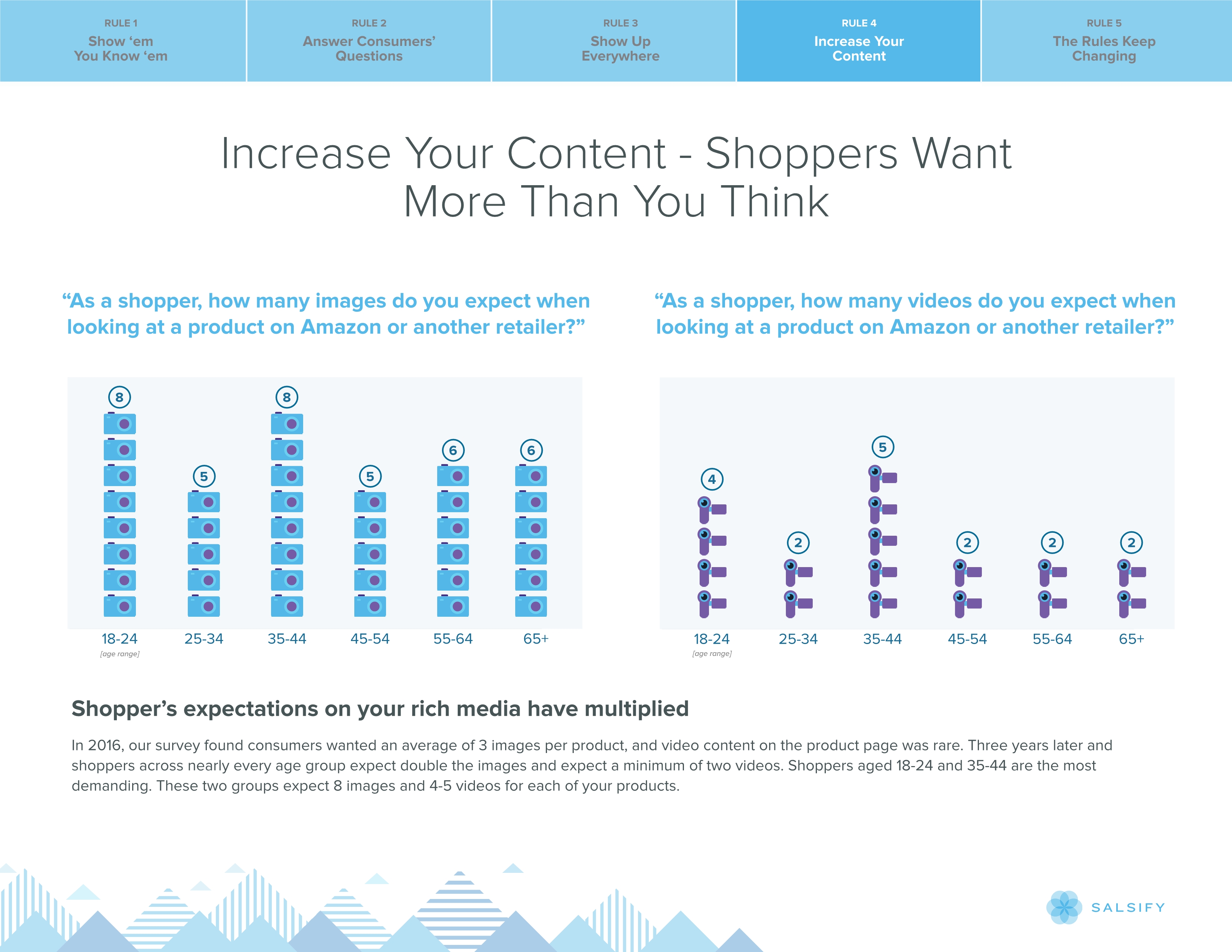 调查发现,18-24岁和35-44岁的消费者对内容的期望值最高,他们都希望看到至少8张图片和4个视频。