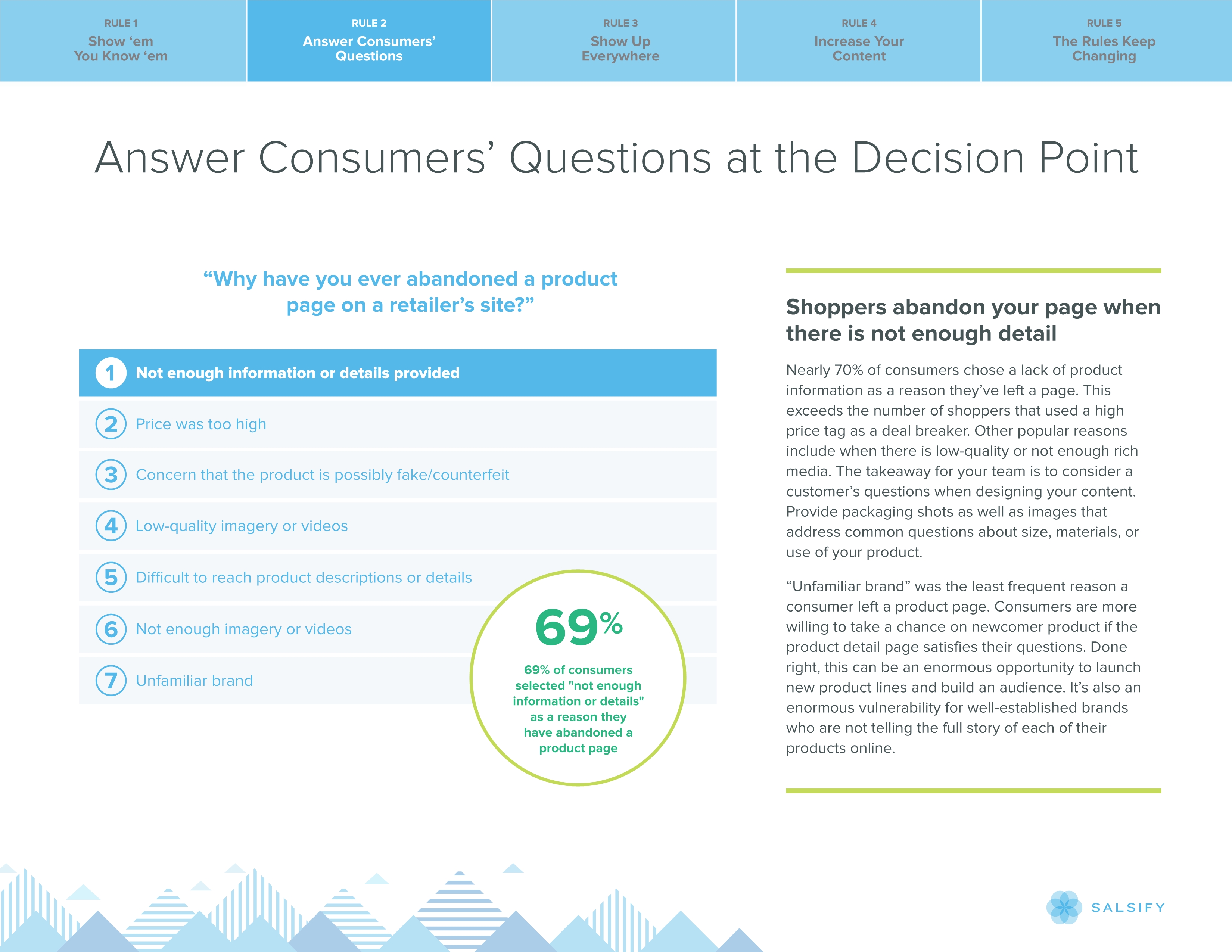 对产品内容需求的增加强调了向购物者提供高质量信息日益重要,仅仅是图像和视频还不够。当Salsify询问消费者为什么放弃零售商网站上的产品时,69%的受访者认为是没有足够的信息或细节。