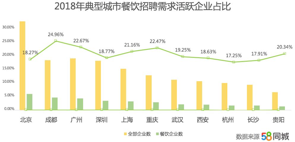 据58同城招聘研究院《2018餐饮行业招聘总结报告》,2018年餐饮招聘需求活跃企业数占比最高的城市是成都,餐饮企业在所有招聘行业中占比24.96%,其次是广州、重庆、上海、贵阳。而在2018年餐饮求职者典型城市分布上,餐饮业活跃求职者数占比最高的城市是重庆,餐饮行业活跃求职者在全行业活跃求职者中占比11.68%,其次是上海、成都、北京、杭州和贵阳等地区。
