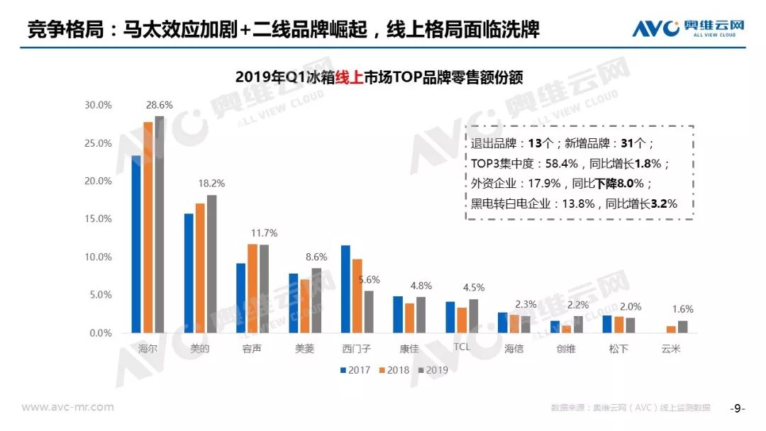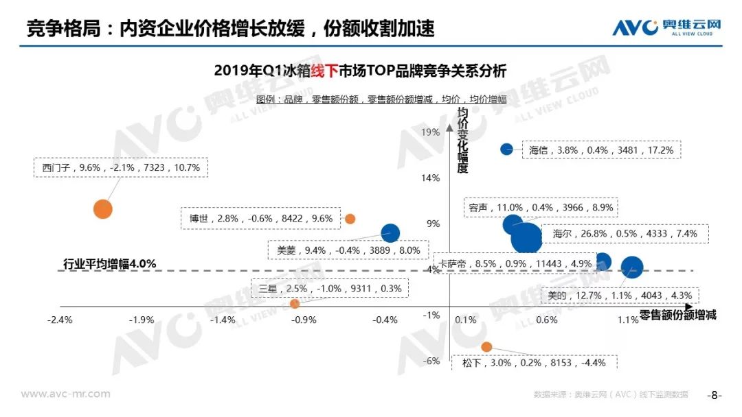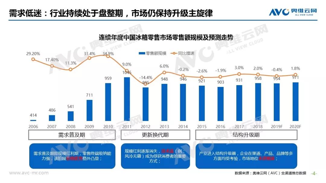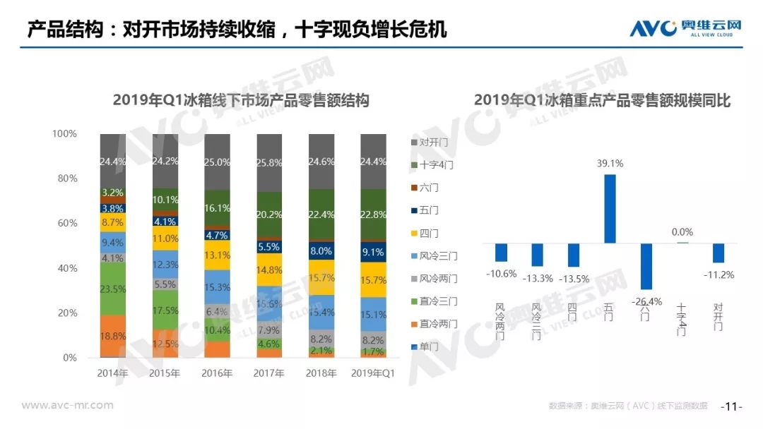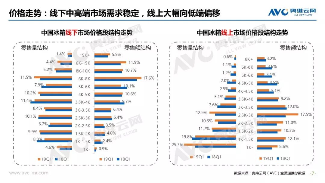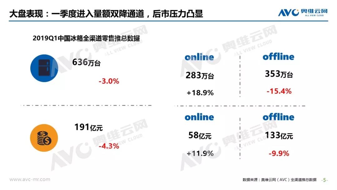 奥维云网(AVC)全渠道推总数据显示,2019年Q1,冰箱市场零售量达636万台,同比下降3.0%,零售额为191亿元,同比下降4.3%。整体市场呈现出需求不旺,价格下探,竞争加剧挑战企业技术实力等特点。