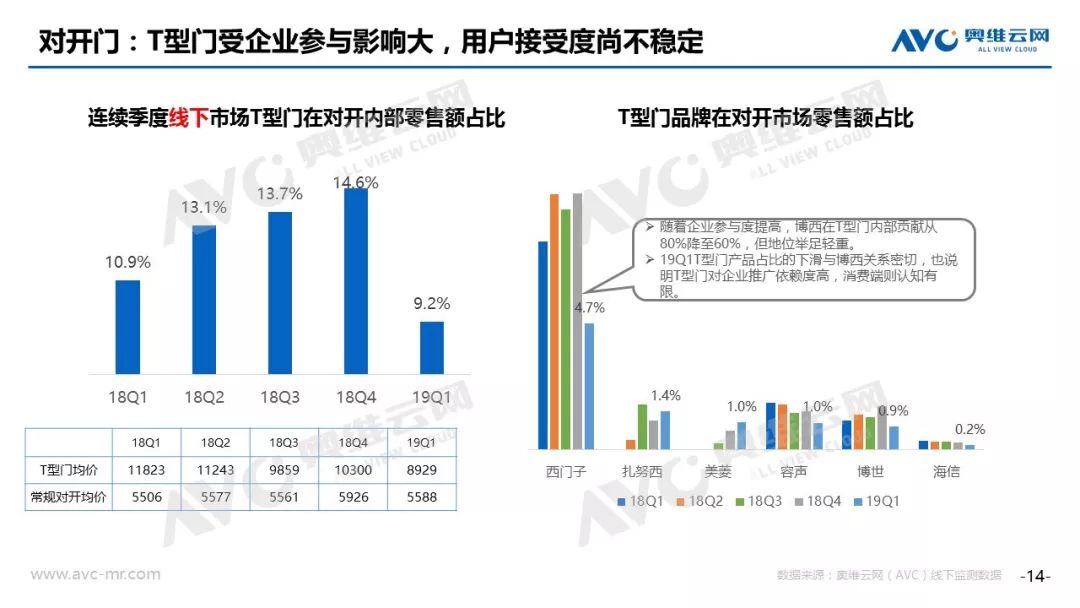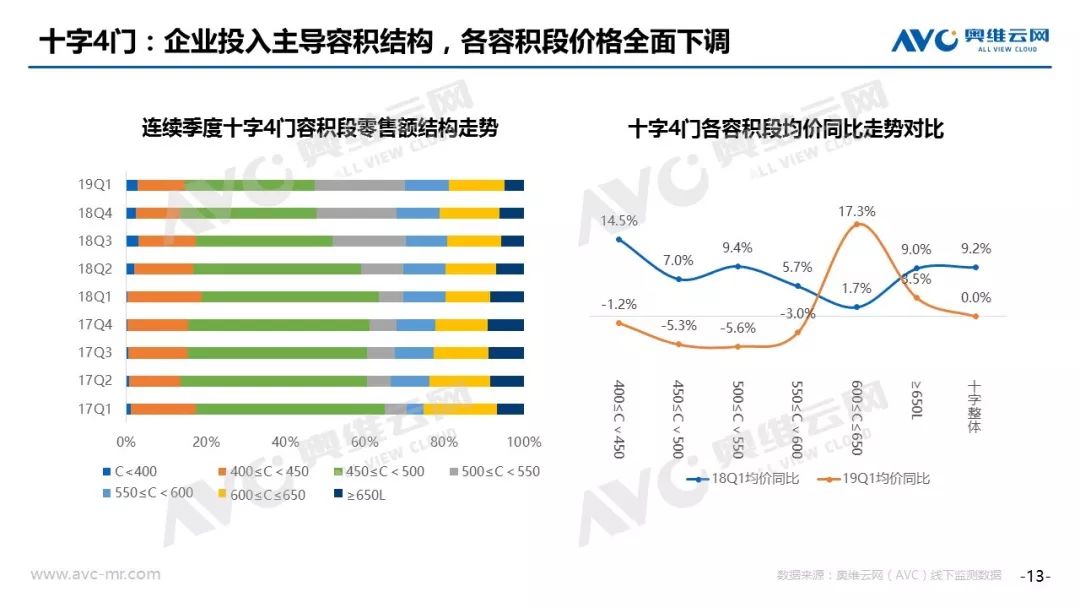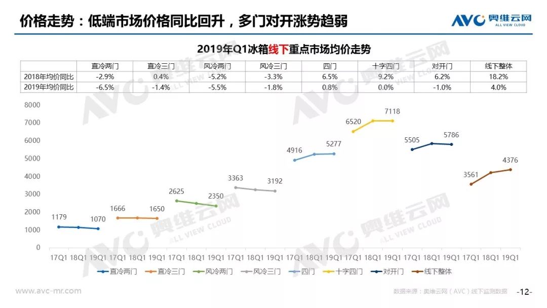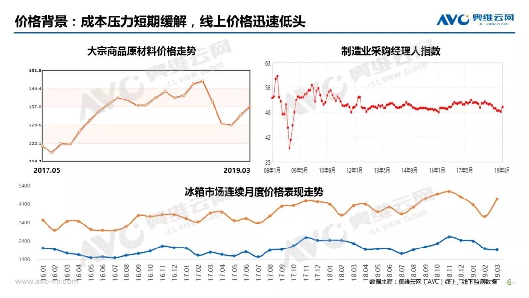 价格出现负增长主要受三重因素的影响:首先,上游成本背景差异较大。2017Q4上游成本处于快速上升通道,而18Q4的上游成本迅速回落,传导至零售终端,19Q1成本压力显著低于同期;其次,结构升级空间收窄。线下市场风冷对直冷的迭代基本结束,对开份额持续收窄,法式和十字的升级节奏显著放缓;反观线上,直冷用户大量存在,价格刺激更是直接带来大量低端需求释放;第三,结构内部的价格竞争激烈。两三门产品价格接近触底,十字价格陷入价格增长瓶颈,对开更是出现负增长。三重因素,2019年冰箱行业在需求低迷的背景下,价格增长势必弱于同期,零售额增长压力较大。