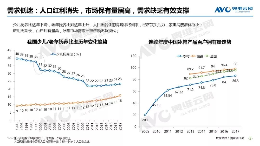 需求方面,国家统计局抚养比相关数据显示,中国人口老龄化日趋严重,整体来看不利于经济活力的释放,对于家电市场而言,人口红利的消失对耐用品消费也出现负面影响。加之当前冰箱市场保有量居高不下,市场严重依赖更新换代。更新需求释放过程相对缓慢,且冰箱产品的季节性特点逐渐减弱,市场节奏与促销的相关度逐渐提升。