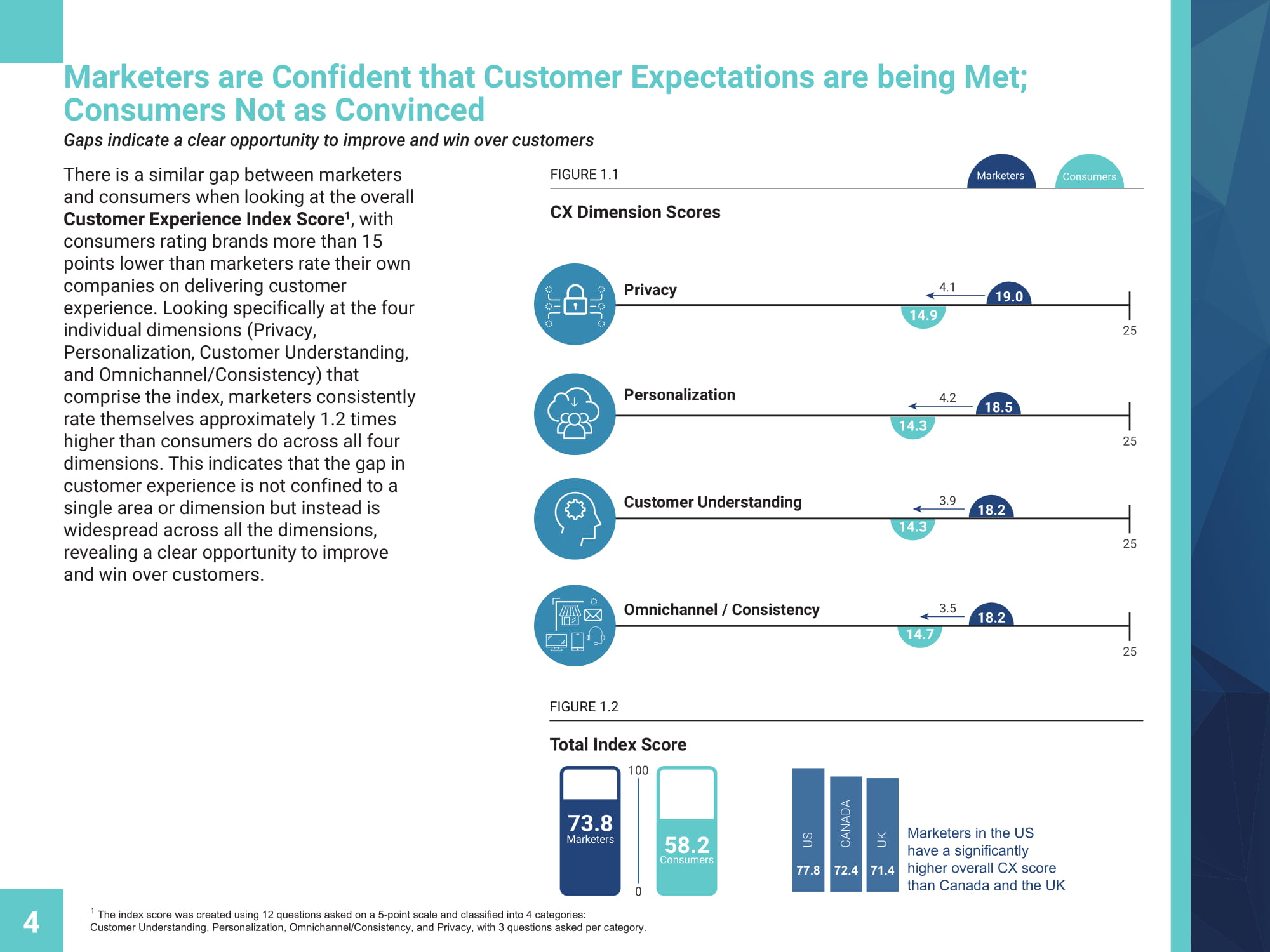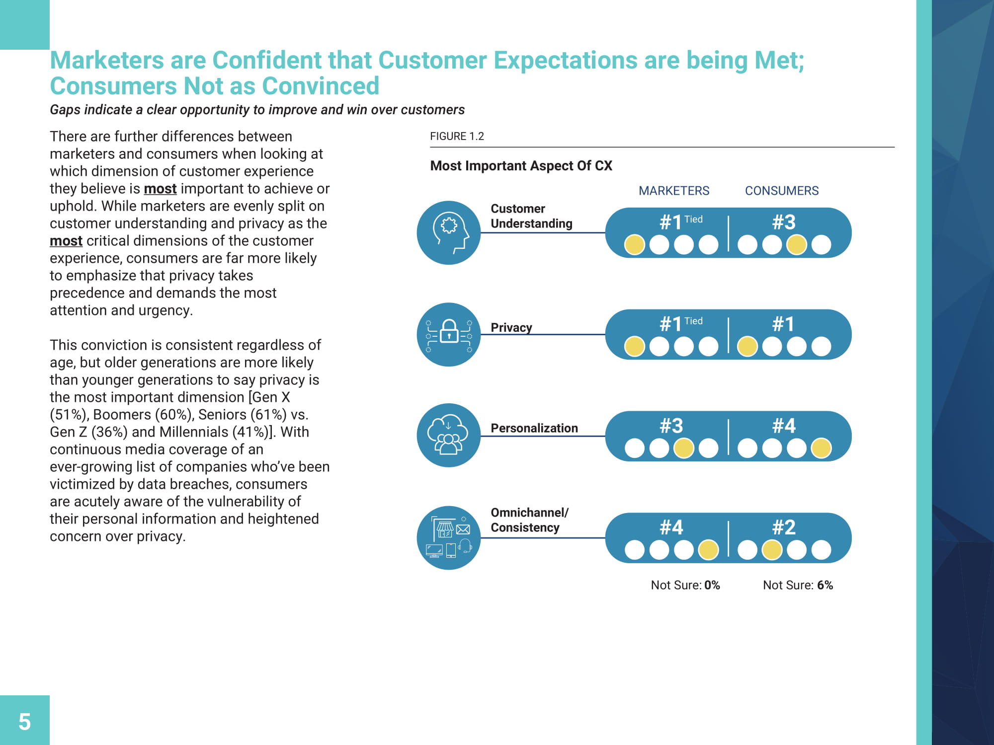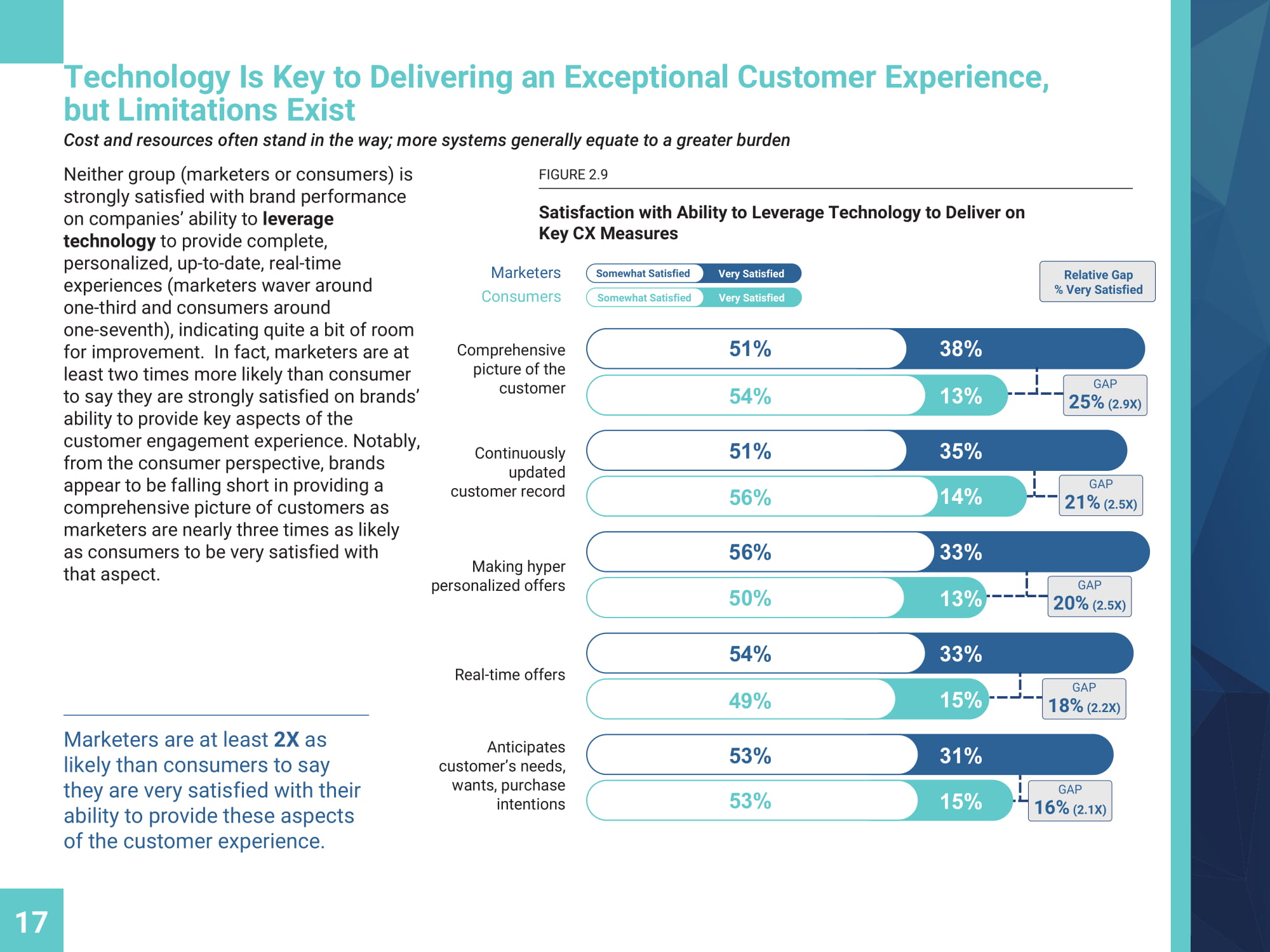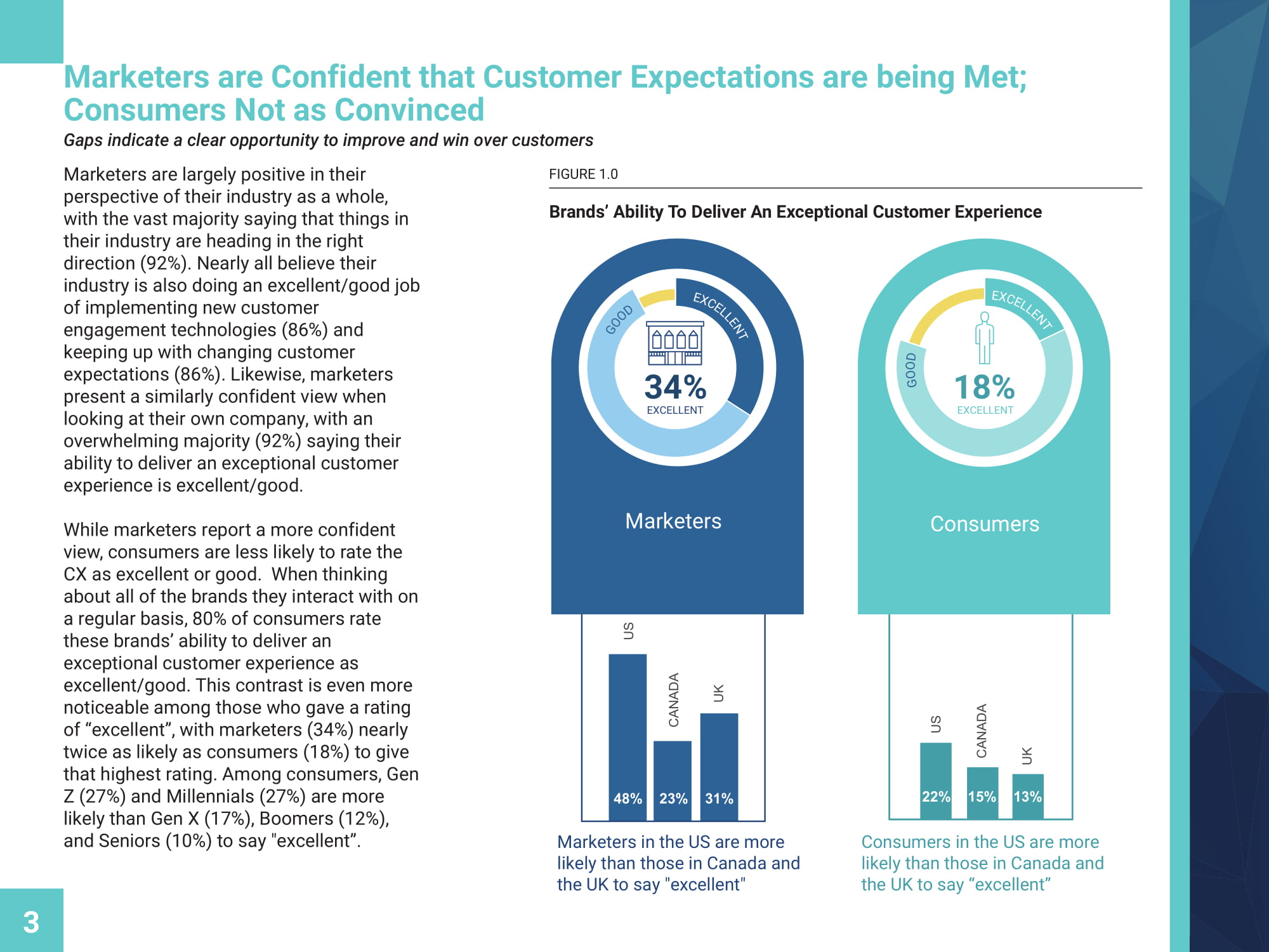 约1/3的受访者表示,当一家公司对他们已经购买的东西发出报价(34%)或发送与他们无关或他们不感兴趣的报价(33%)时,他们感到非常沮丧。营销人员(34%)将提供卓越的客户体验的能力评为“优秀”的可能性大约是消费者(18%)的两倍。