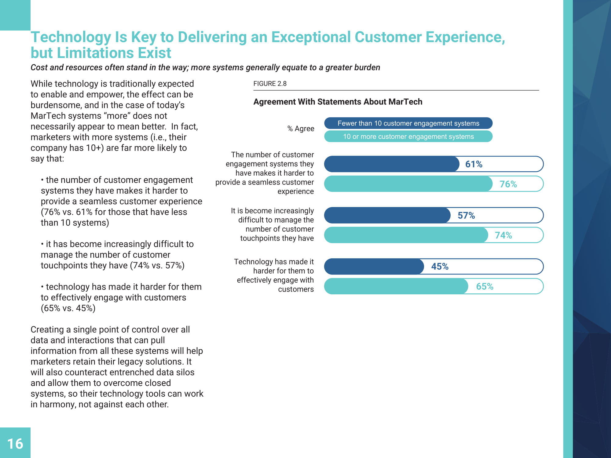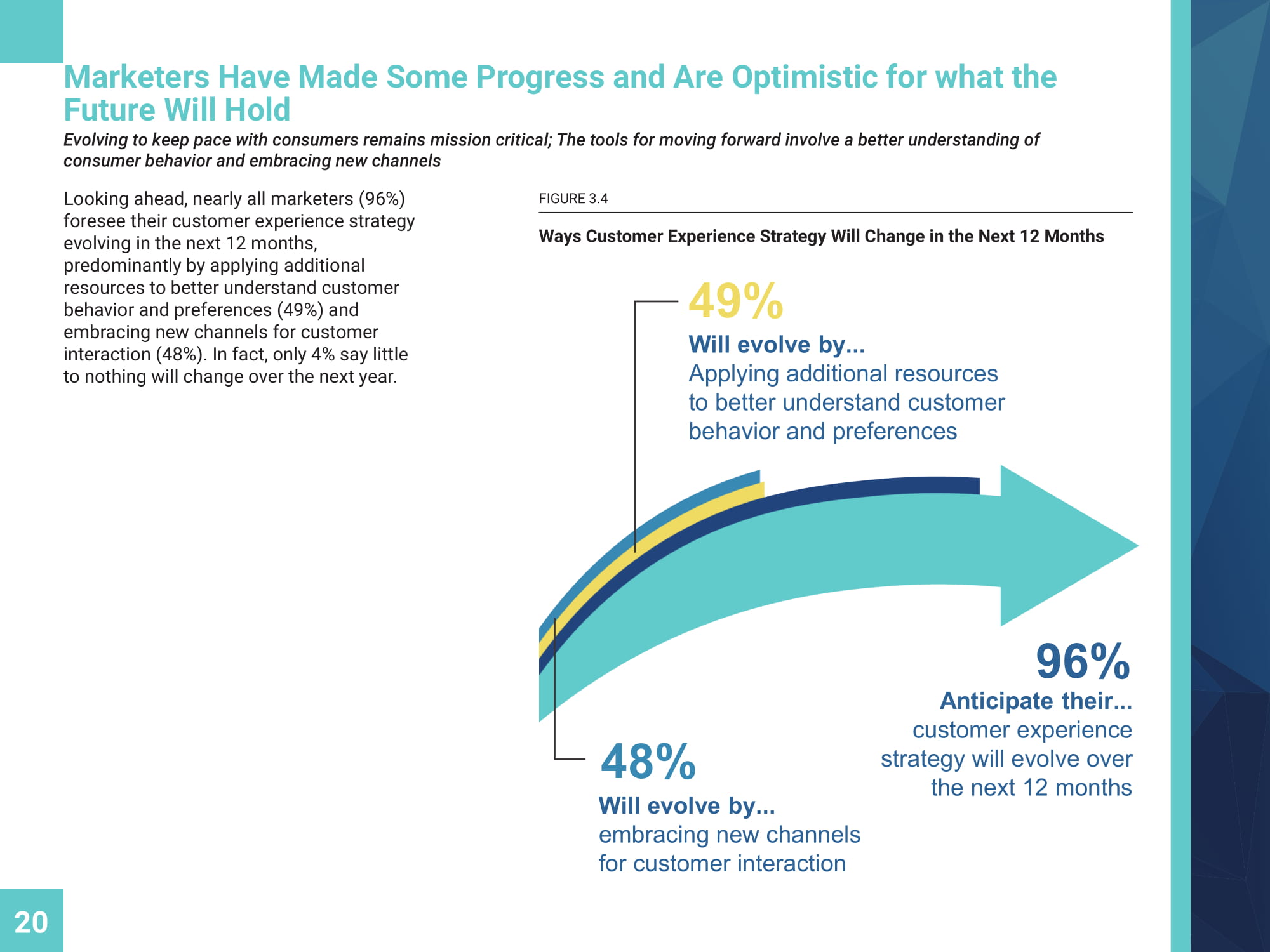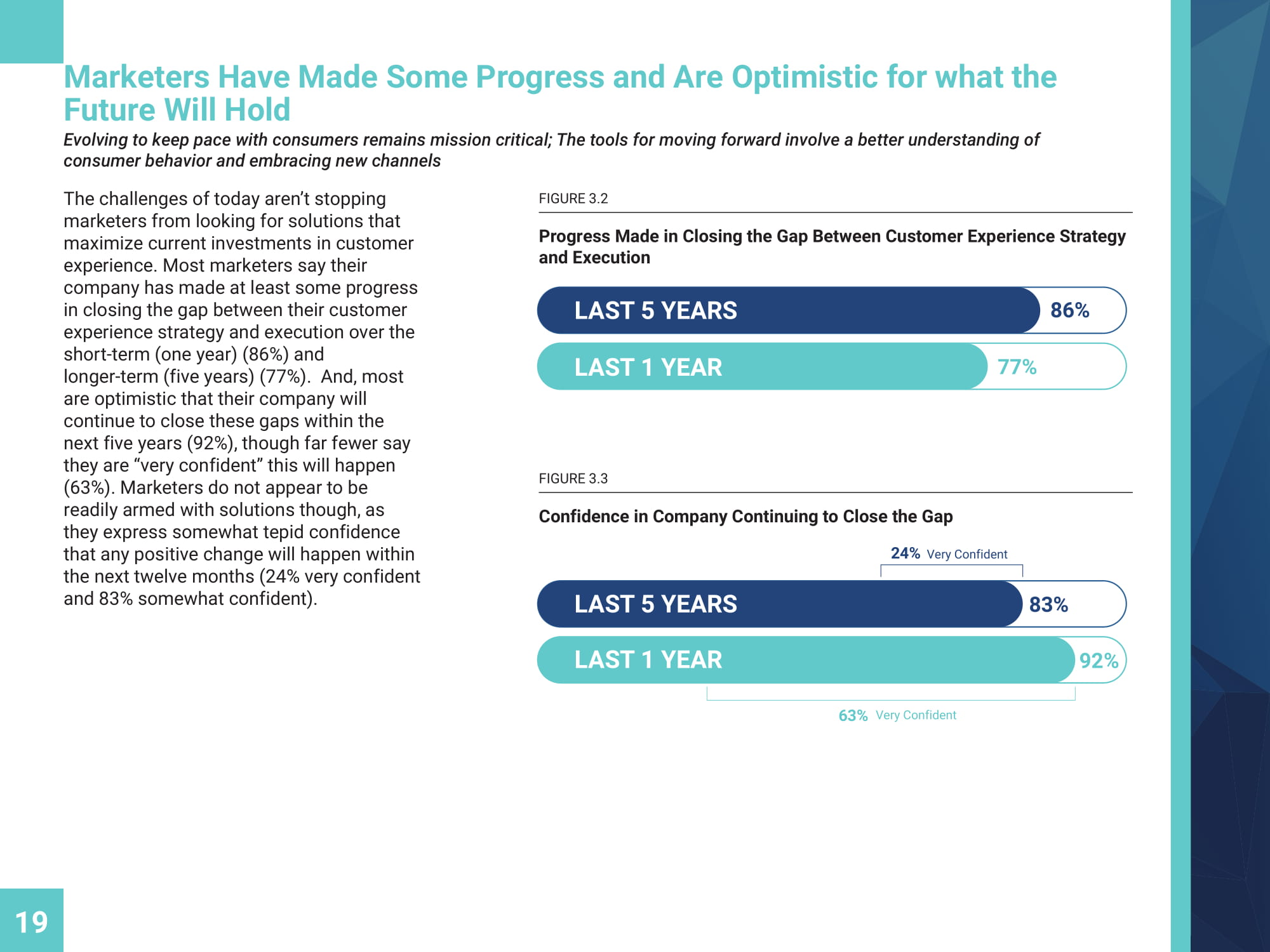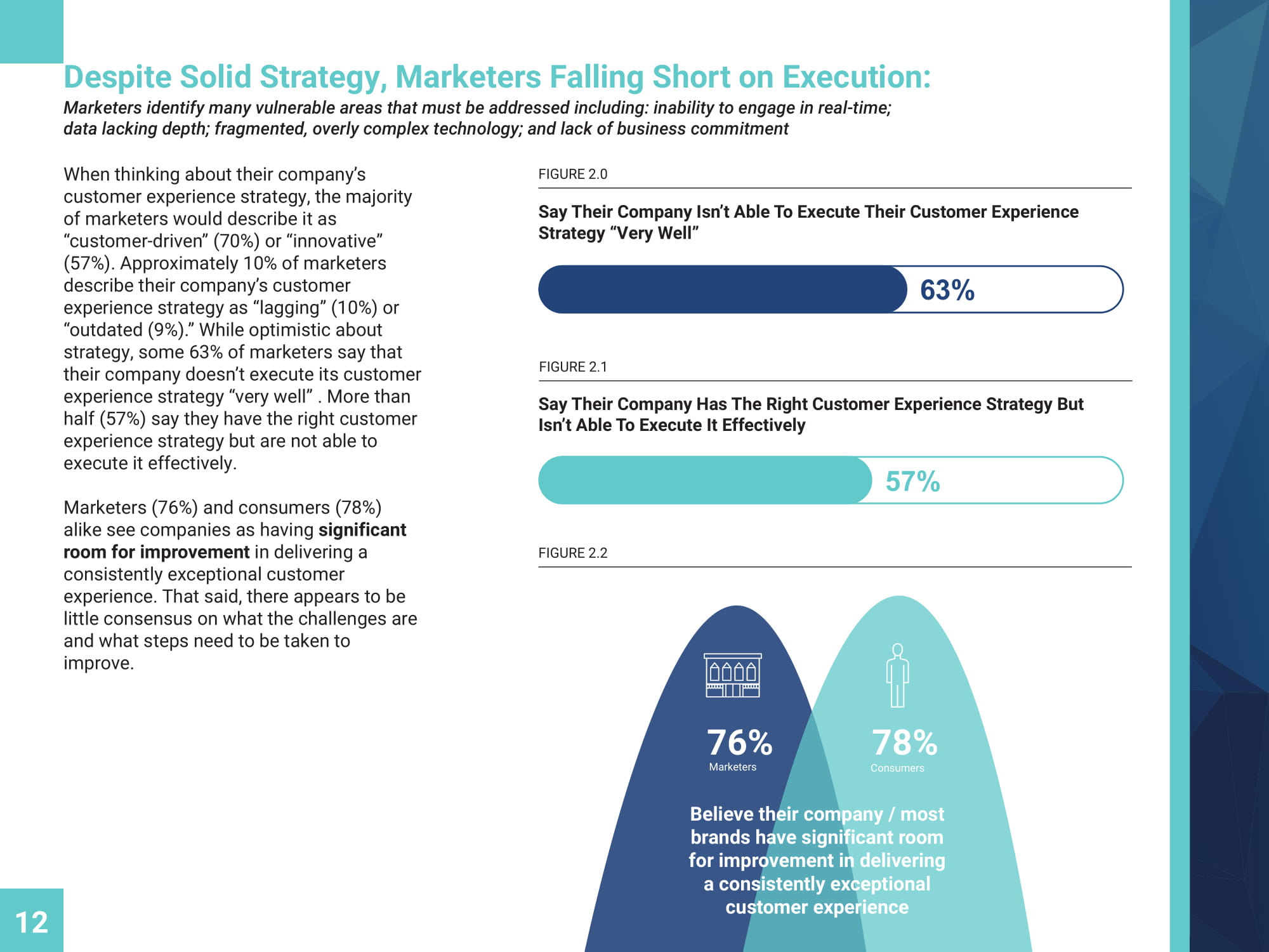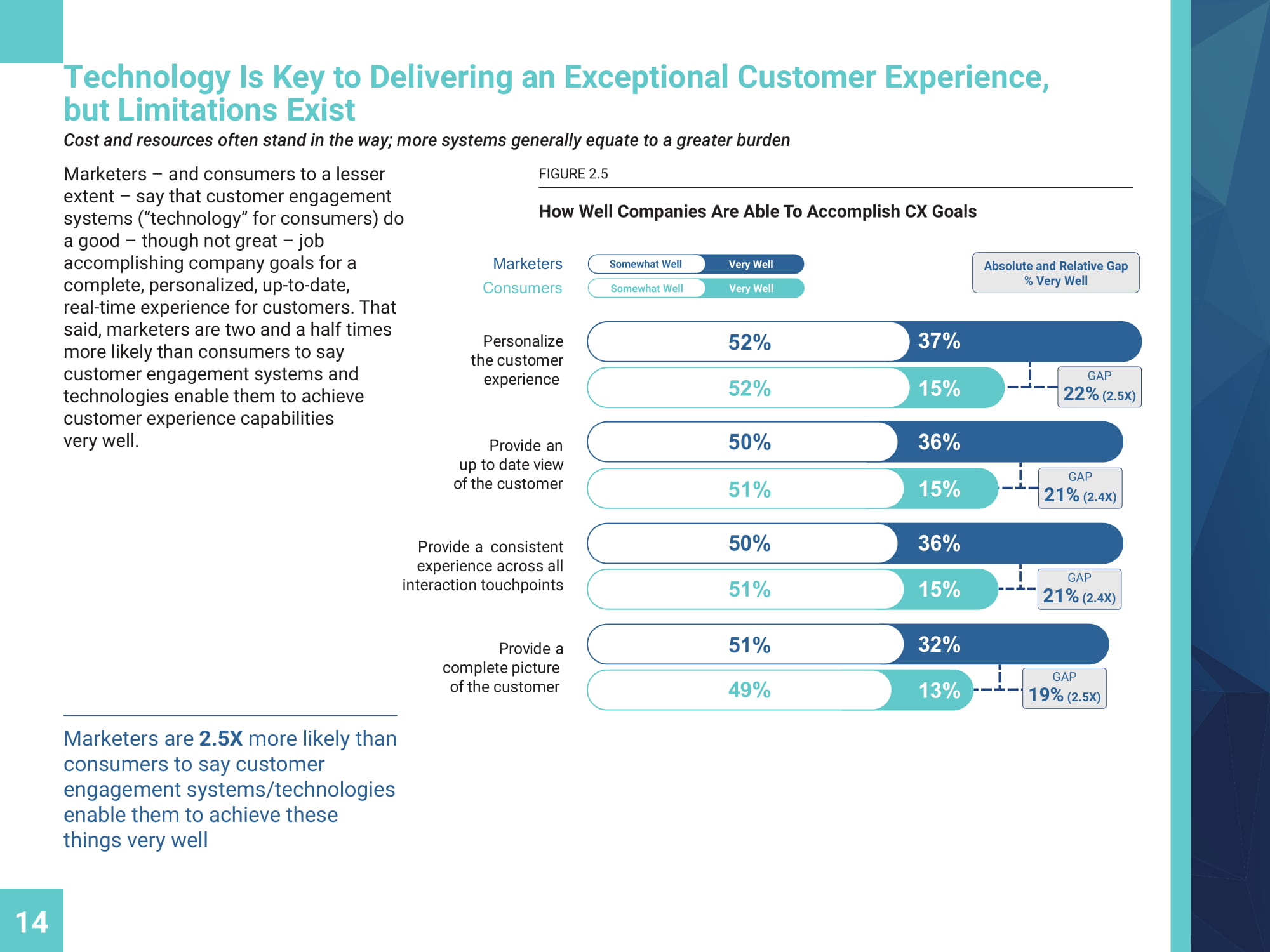 约1/3的受访者表示,当一家公司对他们已经购买的东西发出报价(34%)或发送与他们无关或他们不感兴趣的报价(33%)时,他们感到非常沮丧。营销人员(34%)将提供卓越的客户体验的能力评为“优秀”的可能性大约是消费者(18%)的两倍。