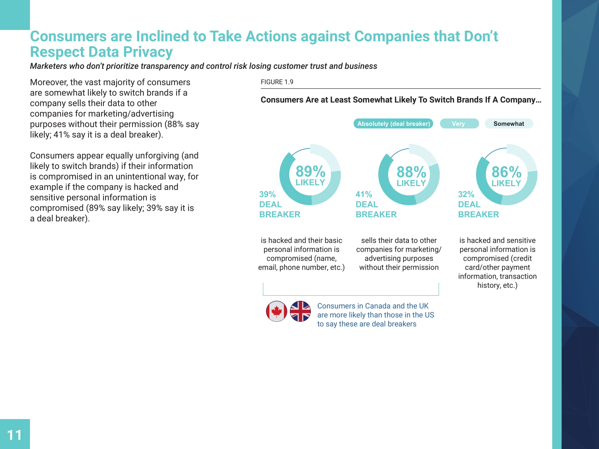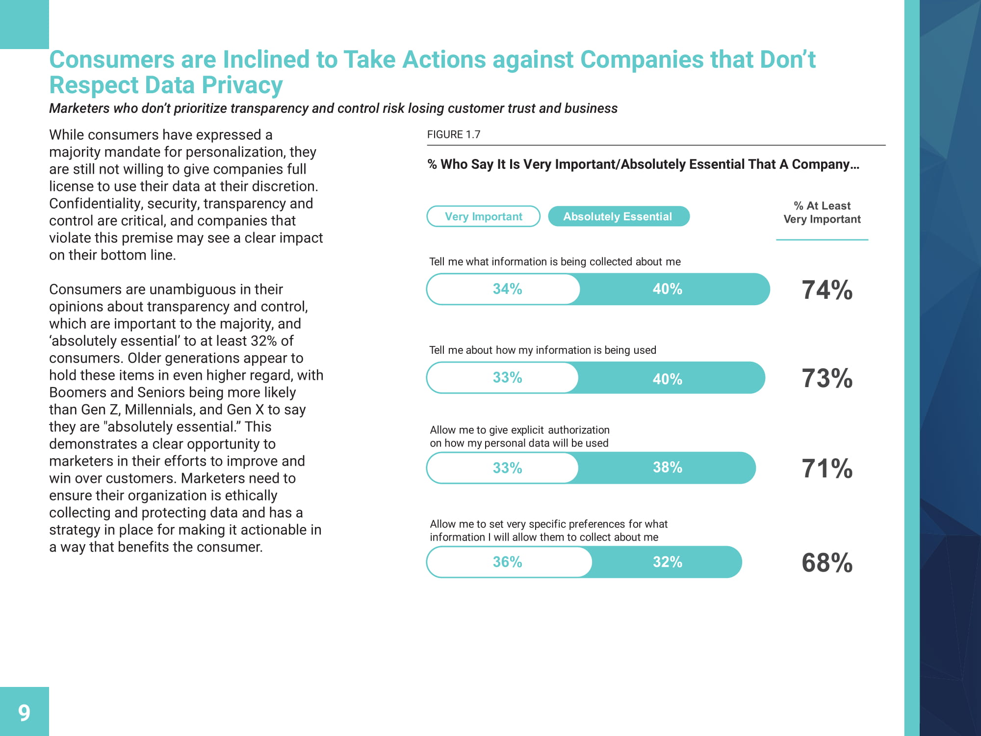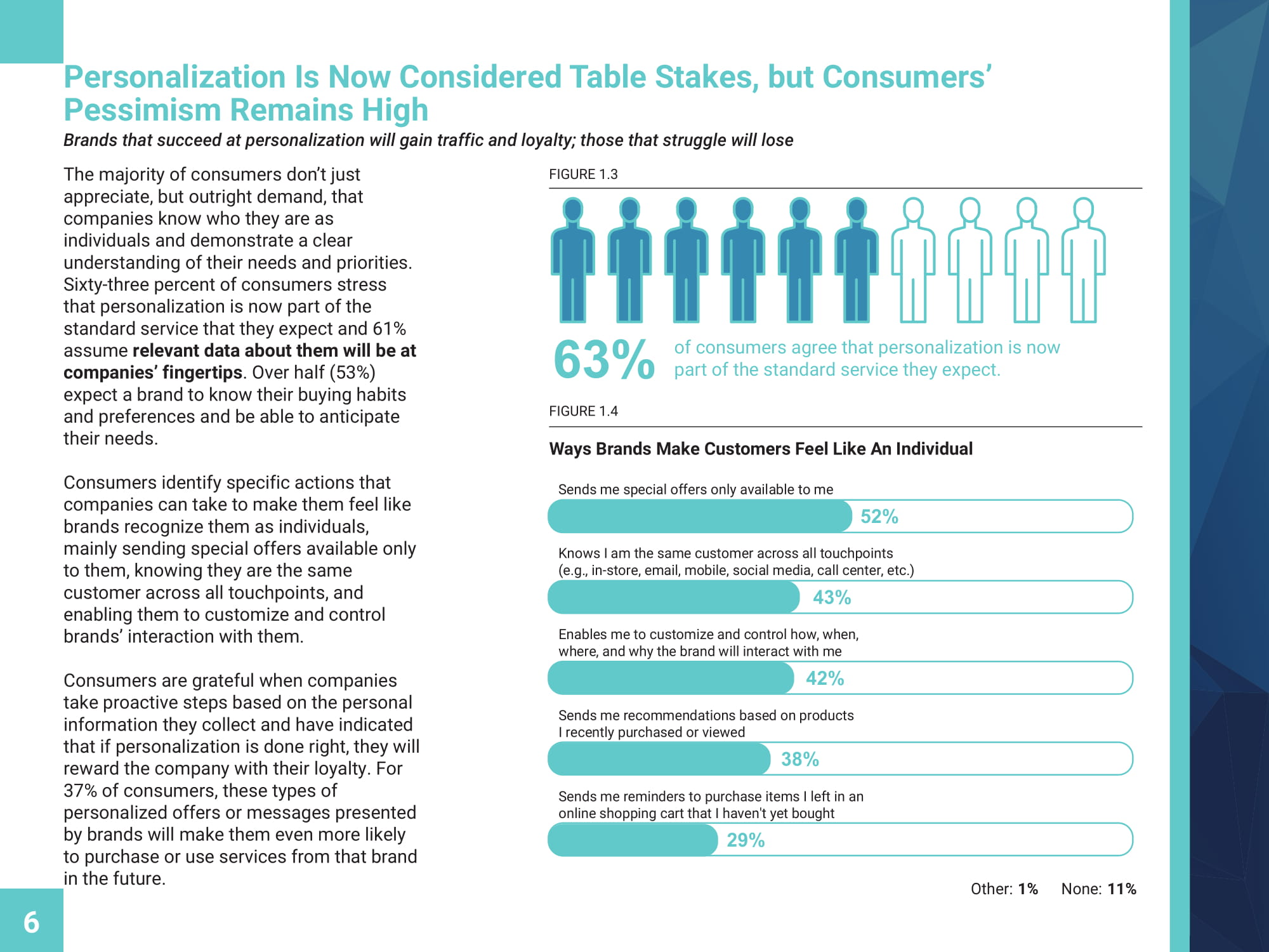 超过4/10的受访者表示,如果一个品牌能够让他们定制并控制如何、何时、何地和为什么与他们互动,他们会觉得自己更像一个单独个体。38%的消费者因为品牌向他们推荐最近购买或观看的产品以及提醒他们(29%)购买留在购物车里的商品时感到欣慰。