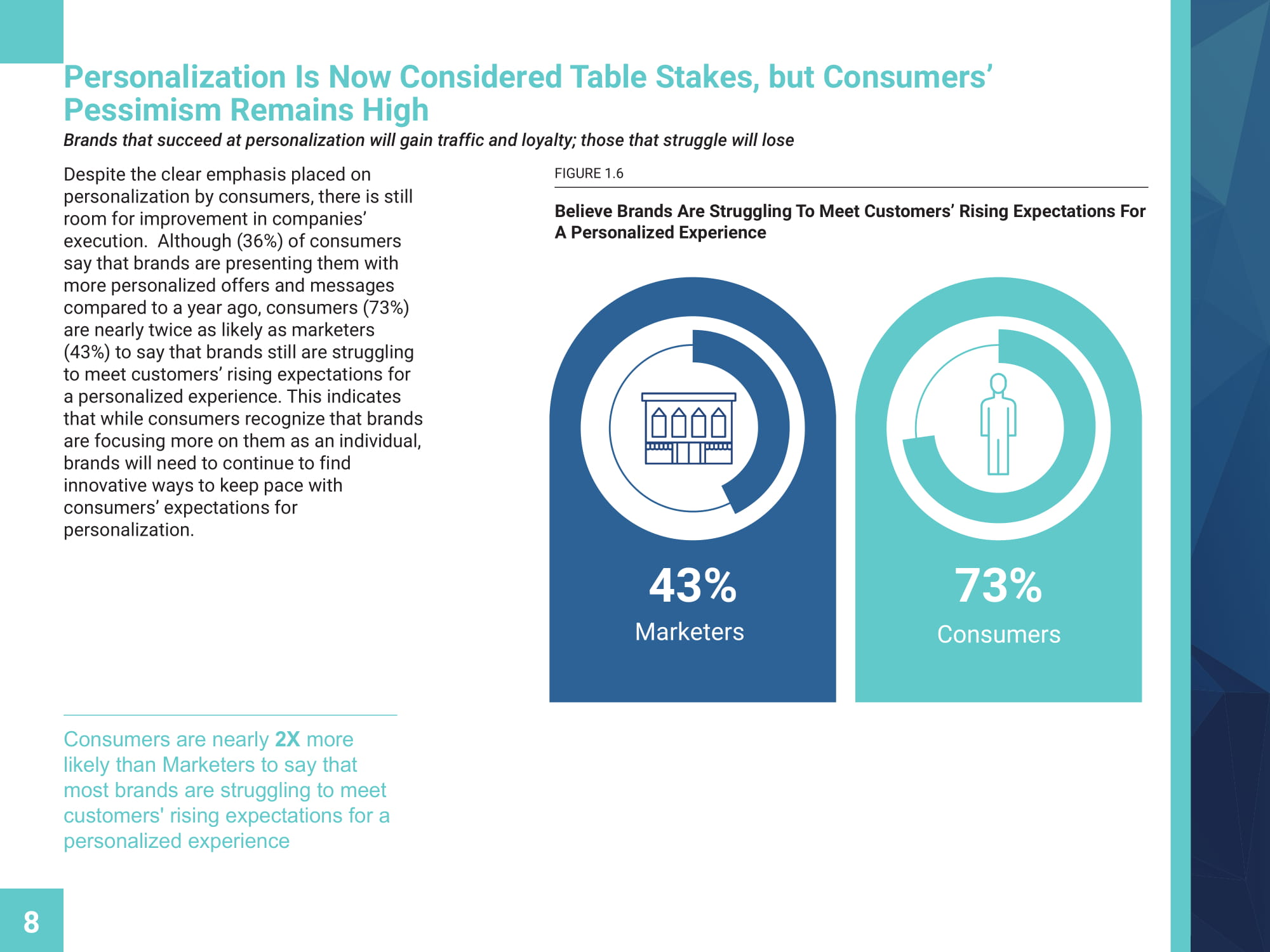 虽然个性化可能是营销人员喜欢的一种策略,但消费者可能会有不同的感觉。近3/4的消费者(73%)认为,品牌难以满足他们对个性化体验的期望,只有不到一半的营销人员(43%)这样认为。