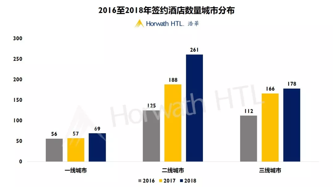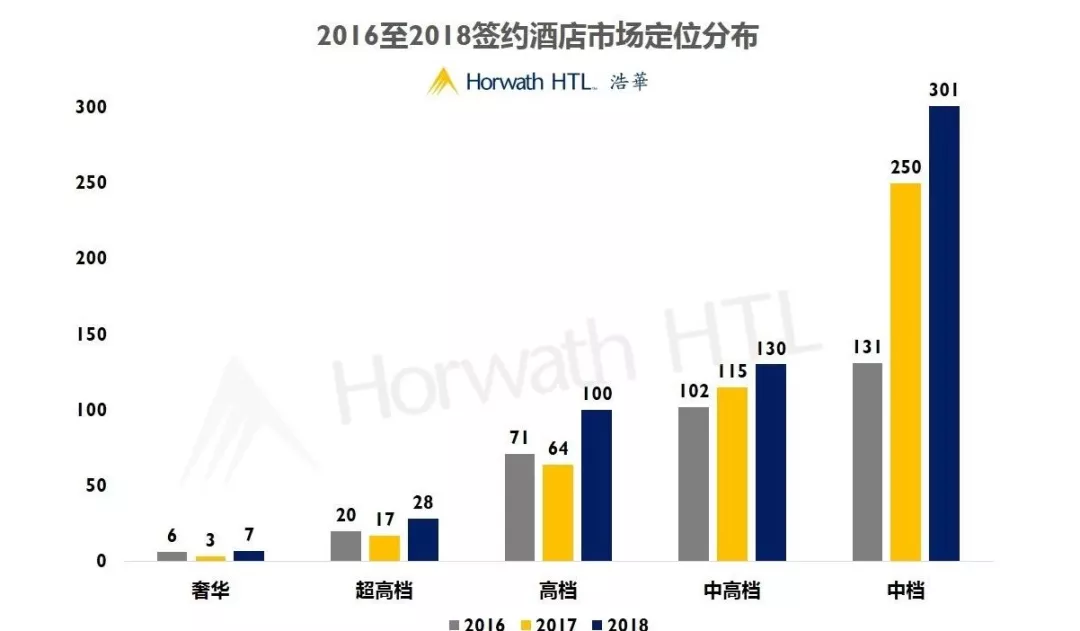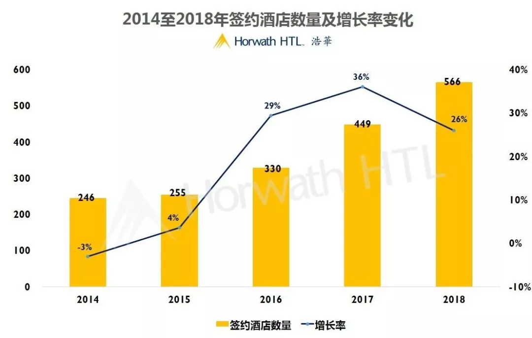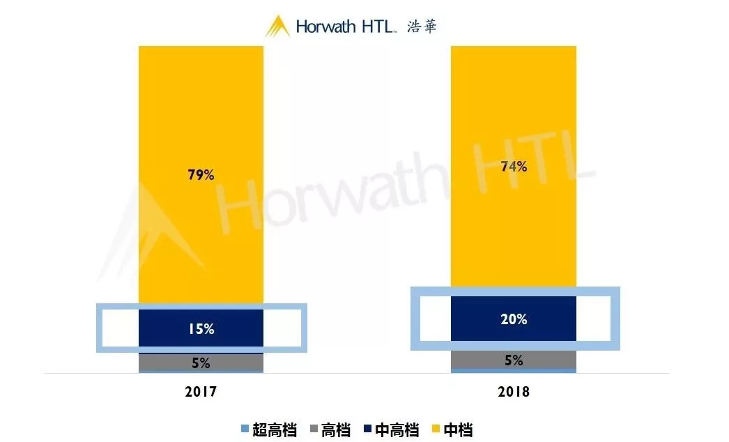中档及中高档酒店层级上,其总签约量为431家,占全年签约量的76%,在体量上依旧是签约主力军。但从增长率的角度看,2018年的增幅为18%,相较2017年的57%有明显放缓。如前文所述,此层级市场群雄逐鹿的剧烈竞争态势使得国际品牌的快速增势不再;国内品牌快速迭代、灵活机变的打法重塑了这一市场的竞争格局。