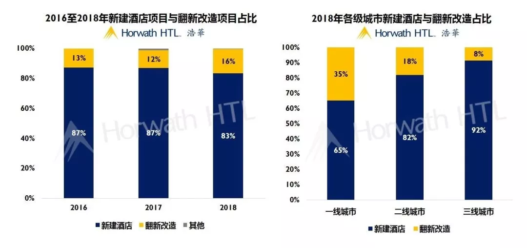 2018年,翻新改造酒店的签约占比表现出上升趋势,达到了16%;其中一线城市的改造项目占比(35%)明显高于二线和三线城市。不难理解,一线城市的酒店业起步较早,已逐渐步入成熟期,其土地资源稀缺为新建酒店的签约设置了难度。但伴随着城市更新及诸多老旧酒店恰逢管理合同到期或面临资产重组转折点,一线城市酒店业通过产品迭代更新重焕生机。