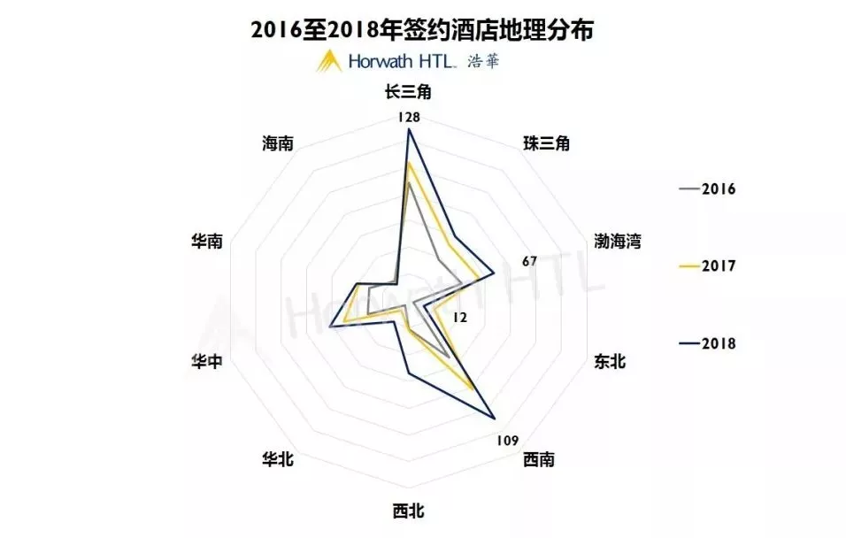 纵览2016至2018年签约酒店的地理分布,位居前三的区域始终是长三角、西南和渤海湾区域。2018年,长三角区域一如既往领跑全国,签约了128家酒店,占全年签约量的23%;西南区域仅次于长三角地区,签约量也过百,占比19%;渤海湾区域虽排名第三,但在签约量上与冠亚军仍有较大差距。