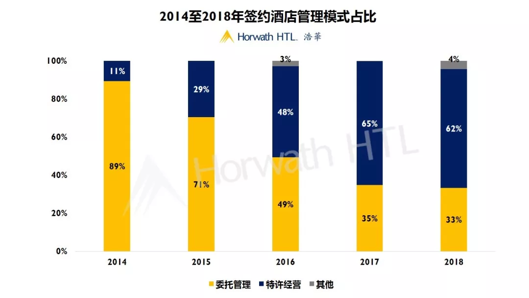 进一步分析特许经营模式中各层级酒店的占比,我们发现,2018年中高档酒店占比较2017年提升了5个百分点,这表明紧随中档酒店的步伐,越来越多国际品牌正悄然开放中高档层级酒店的特许经营权。究其原因,一方面源自中国业主日益丰富的酒店运营经验,另一方面来自日益显著的品牌竞争压力。从长远来看,国际品牌对高档酒店的特许经营权开放目前仅仅拉开序幕。
