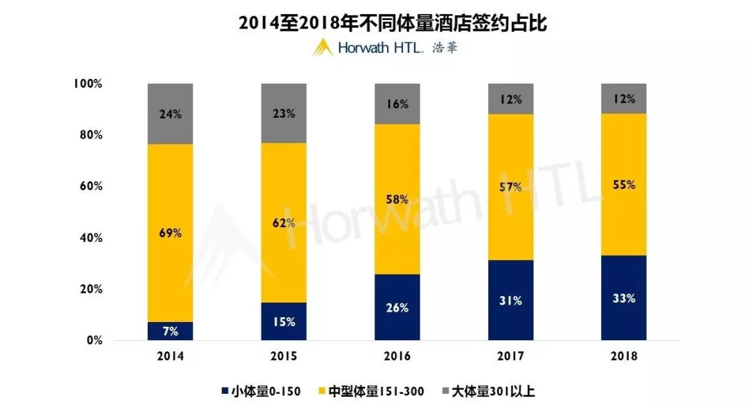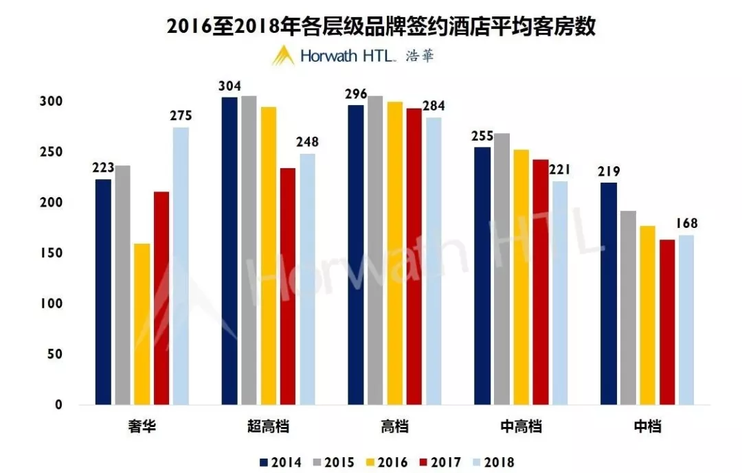 按酒店客房体量划分,不难发现,过去五年小体量酒店(客房量在150间以下)的签约量呈现显著增长趋势,签约占比由2014年的7%跃升至2018年的33%。反之,大体量酒店(客房量在301间以上)签约占比呈现下滑态势,由五年前的24%骤降至近两年的12%。此占比变化主要是受到中端酒店签约数量大幅增长的影响。以老旧物业改造为主的中端酒店受限于原物业形态,通常客房规模不大。此外,各档次酒店的平均客房数呈现缓慢下降趋势也影响了此体量占比变化。