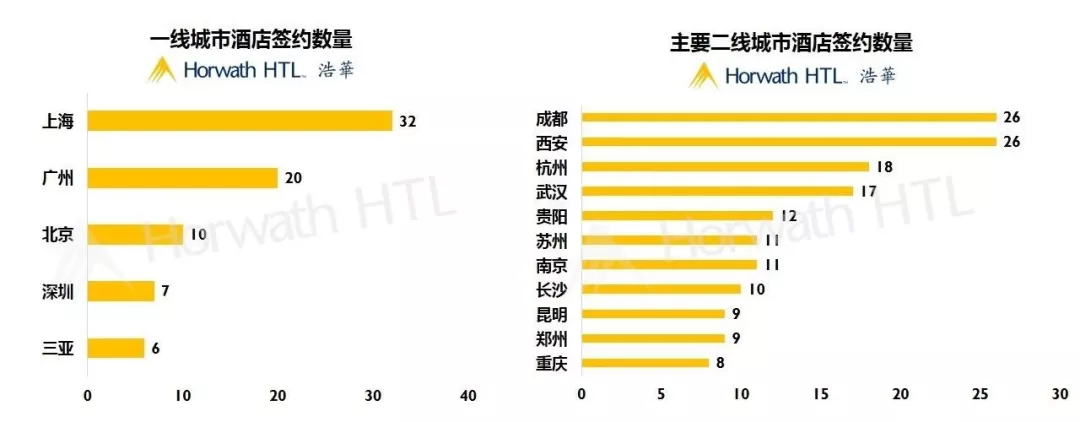 从城市维度看,上海以32家的签约量荣登全国城市榜首,其签约项目中一半为中端酒店的翻新改造。二线城市中,成都和西安两座西部门户城市成绩突出,并列第一,各签约26家,签约项目多为新区开发所带来的新建项目。值得一提的是,武汉签约了17家酒店,首次跃升为二线城市第三名,成为华中地区最受欢迎的投资城市。成都、西安和武汉的投资热度很好的呼应了国家中心城市的选定与其战略发展规划。